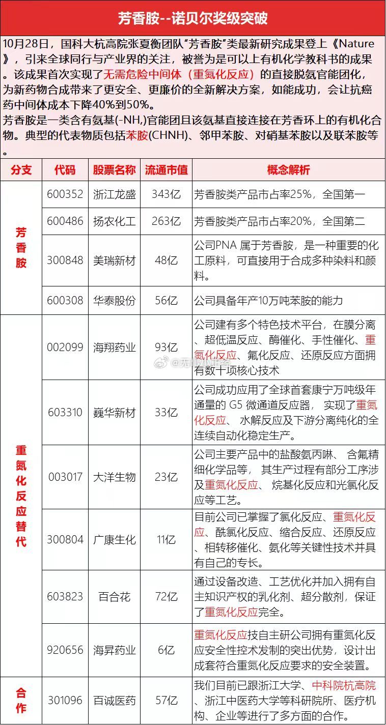 芳香胺概念股:国科大杭州高等研究院团队在《自然》发表论文,提出全新直接脱氨官能团化方法,有望替代已沿用140年、存在爆炸风险的传统工艺。该技术安全经济,可公斤级合成,将在制药、材料等领域广泛应用。