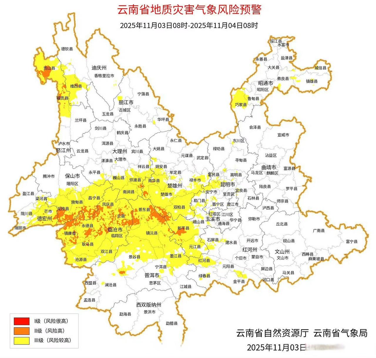 【云南省地质灾害气象风险预警】2025年11月03日08:00~11月04日08:00,玉溪市新平县,保山市昌宁县、施甸县、龙陵县,楚雄州楚雄市、南华县、双柏县,普洱市景东县、镇沅县、墨江县、景谷县、澜沧县,大理州弥渡县、南涧县,德宏州芒市,怒江州贡山县、福贡县,迪庆州维西县,临沧市临关翔区、凤庆县、云县、永德县、镇康县、耿马县发生滑坡泥石流的风险高;昆明市北部、西部和南部,昭通市东部、中部至西南部,玉溪市东北部、中部至西部,保山市东部至南部,楚雄州东部、南部至西部,红河州西部、南部,普洱市北部至中部、南部,大理州中部、东南部,德宏州中部至东南部,丽江市东部、中部和西部,怒江州北部至中部,迪庆州东部、西部,临沧市大部发生滑坡泥石流的风险较高。(云南气象)