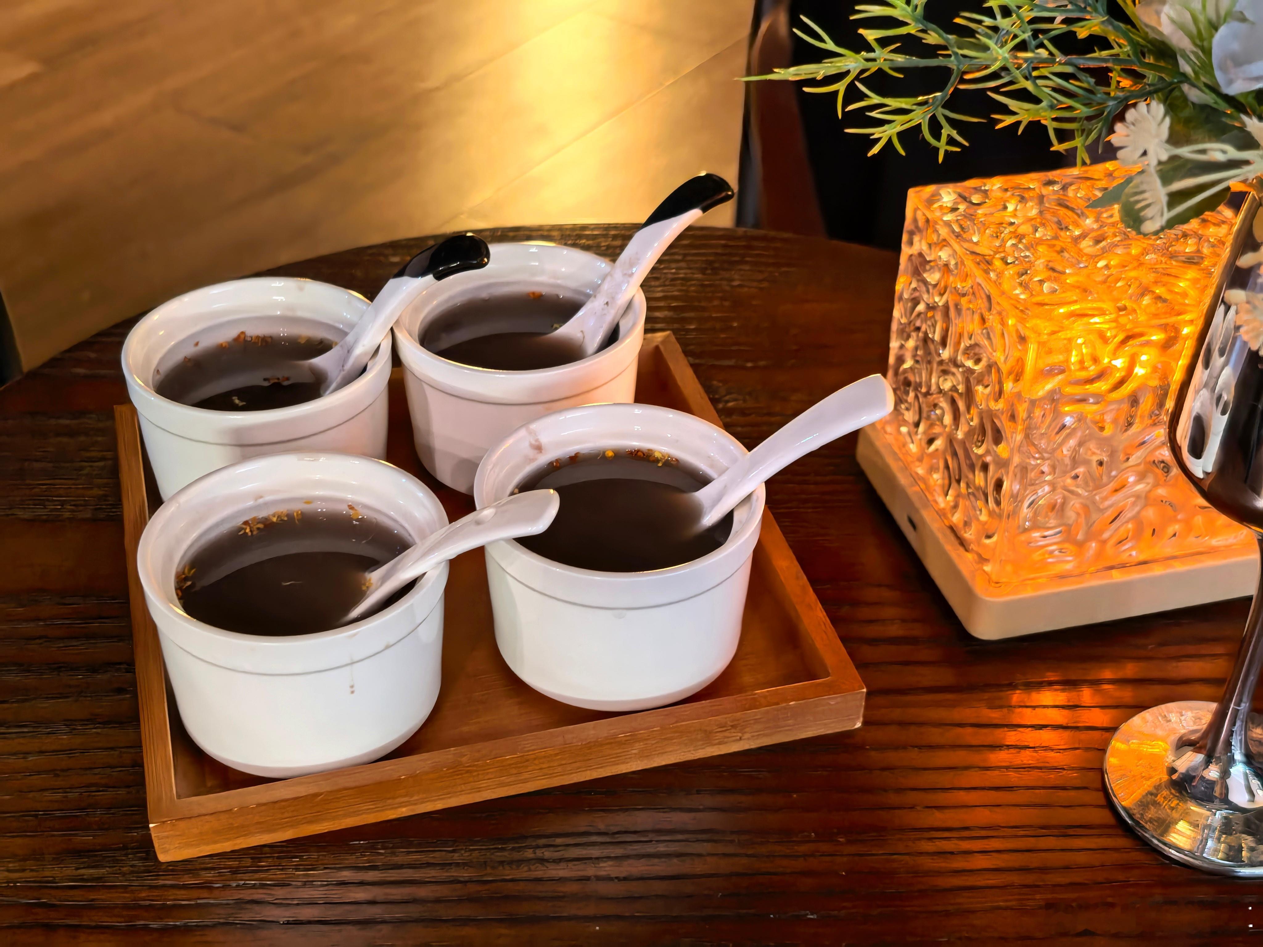到酒店了,山顶上也太冷了,但是酒店很贴心,给我们准备了暖胃的红豆桂花酒酿,喝着心