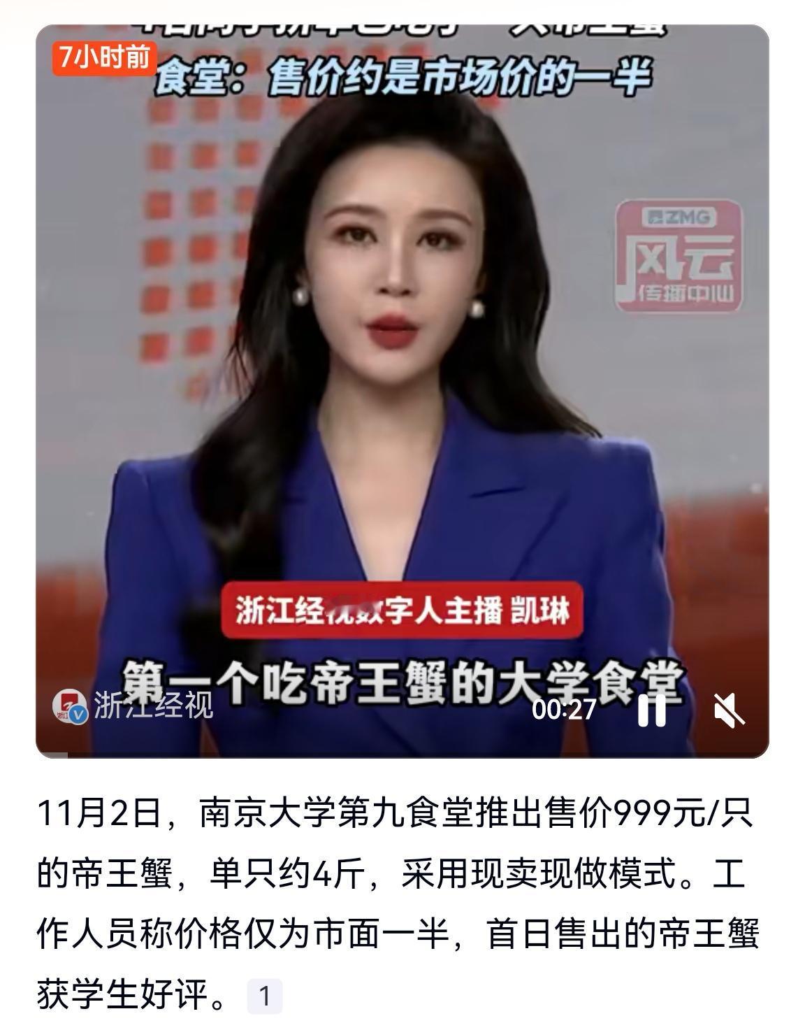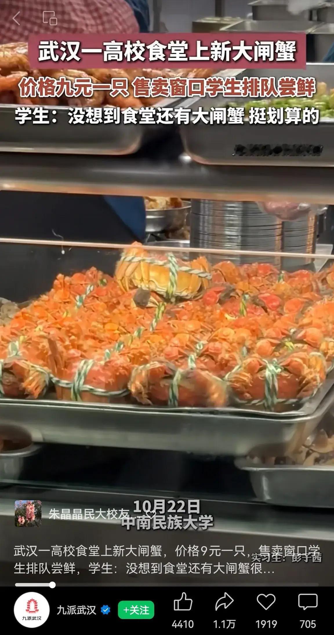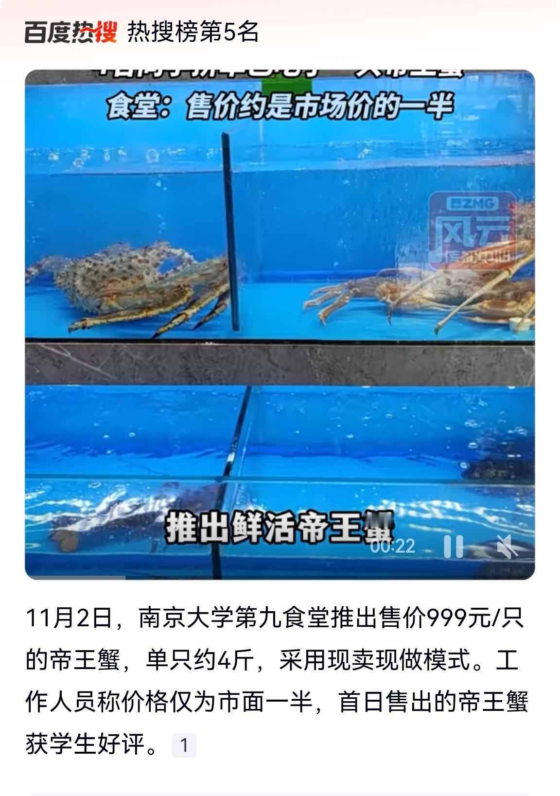 惊爆!南京大学食堂推出999元一只的大螃蟹,而武汉中南民族大学食堂卖大闸蟹仅9.9元,就是所谓的天差地别吧。 虽然南京大学食堂推出的是帝王蟹。但归根结底,它还是螃蟹。南大方面称比市场价要便宜一半。 此言应该也不虚。一经推出就已售罄。不得不感慨现在的学生的生活条件是真好啊。