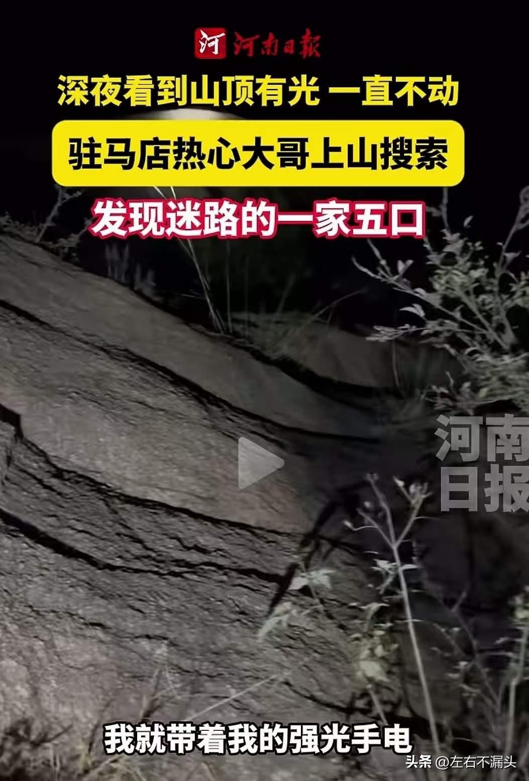 河南驻马店,男子深夜看到山顶有光一直不动,于是上山搜索,结果发现迷路的一家五口!