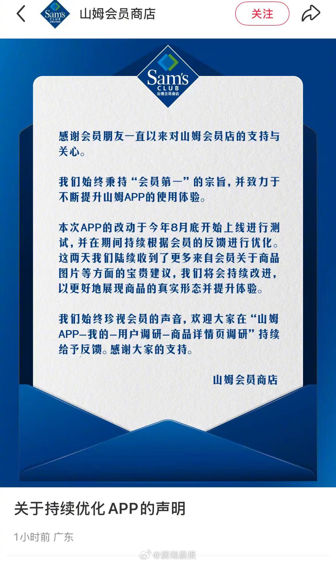 【#山姆把头图改回来了#,#山姆回应把产品实拍图更换成精修图#】11月3日晚,山姆会员店官方发布关于持续优化APP的声明。回应全文如下:本次APP的改动于今年8月底开始上线进行测试,并在期间持续根据会员的反馈进行优化,这两天我们陆续收到了更多来自会员关于商品图片等方面的宝贵建议,我们将会持续改进,以更好地展现商品的真实形态并提升体验。