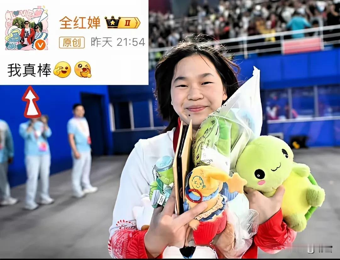 全红婵, 用一句“我真棒” 展现了她 乐观自信的人生态度。 经历180多天的伤病恢复与状态调整, 她重返赛场, 与新搭档仅磨合三周, 赛前还带着未完全愈合的旧伤。 然而, 她凭借精湛的“水花消失术”, 一鸣惊人, 以近乎完美的表现征服了全场观众。 她用实际行动向那些 曾对她的状态提出质疑的人证明, 真正的实力无需多言。 真正的王者, 即使面对伤病与困难, 也能凭借坚韧不拔的毅力和默默无闻的努力, 重新站上巅峰。 她的归来, 不仅是一次自信的展现, 更是一种对自我价值的坚定信念。 全红婵用她的汗水与拼搏, 诠释了体育精神的真谛, 成为所有人心中的王者。 全红婵 全红婵勇夺冠 跳水冠军婵 全红婵传奇人生 全红婵语录