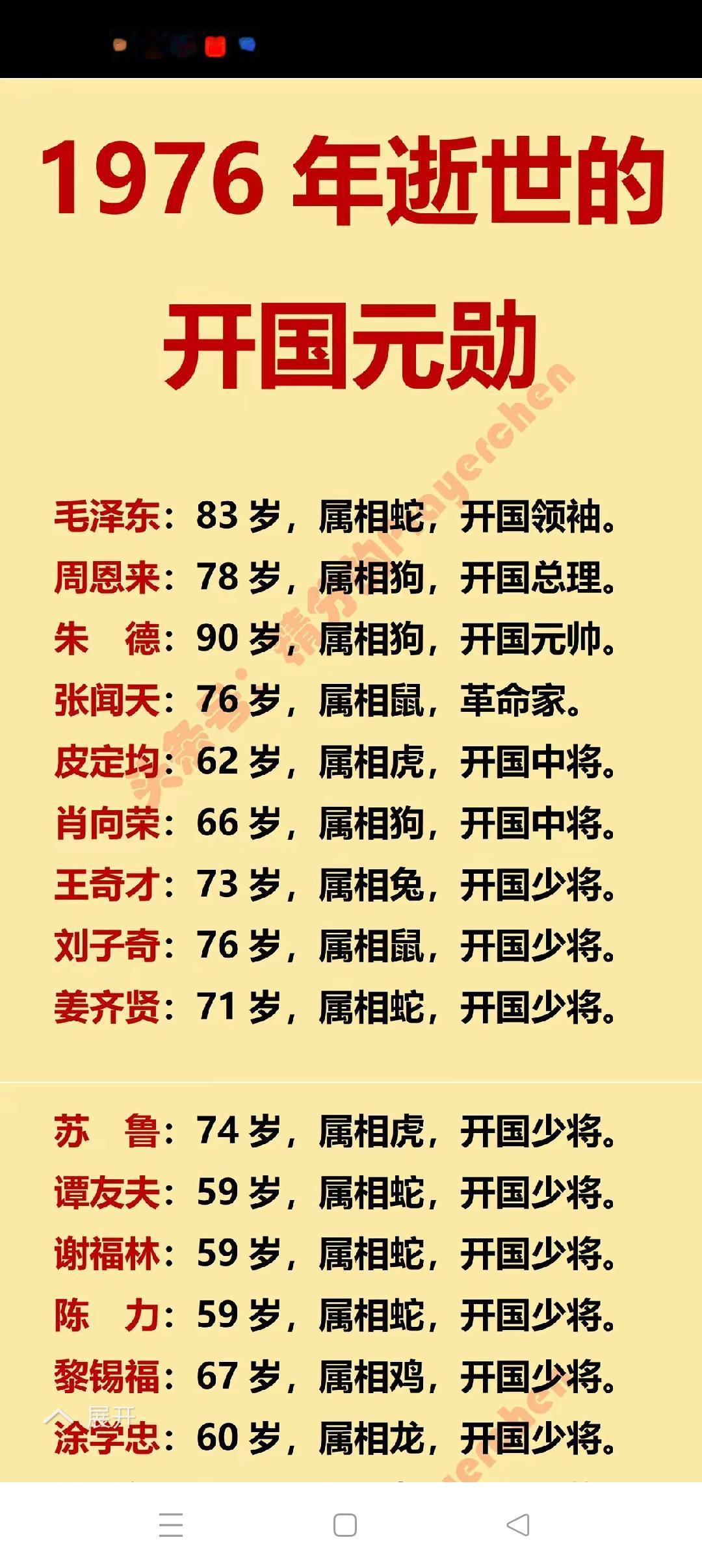 难忘的1976 1976年是我们国家最难忘的一年! 这一年,是我们党和国家及军队领导人以及开国将领逝世人数最多的一年:敬爱的毛主席、周总理、朱老总离开了我们;无产阶级革命家、我党的卓越领导人张闻天同志离开了我们;皮定均将军等21位开国将军离开了我们; 这一年,唐山发生了8级特大地震,24.2万人遇难,16.4万人受重伤,人民的生命财产受到建国以来最大的损失; 这一年,我们党一举粉碎了“四人帮”,结束了文化大革命,中国进入了一个崭新的阶段。