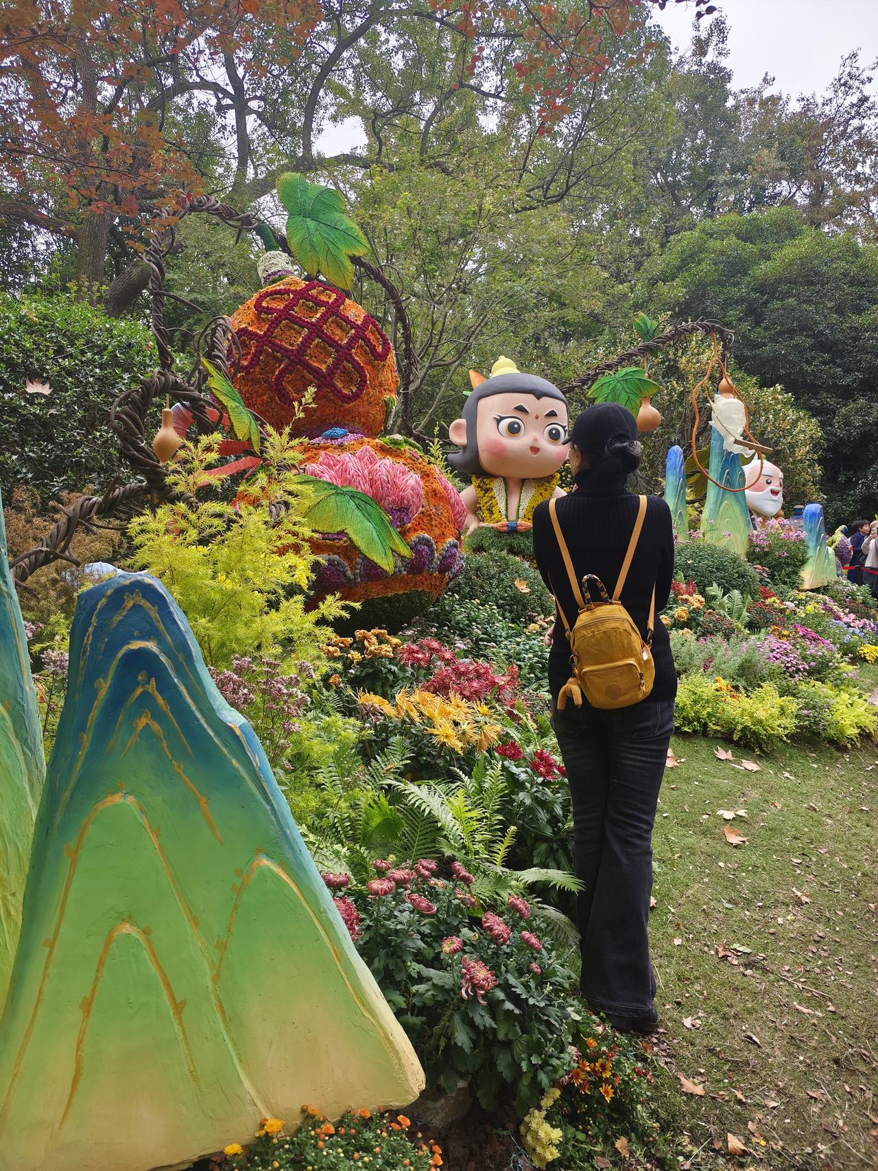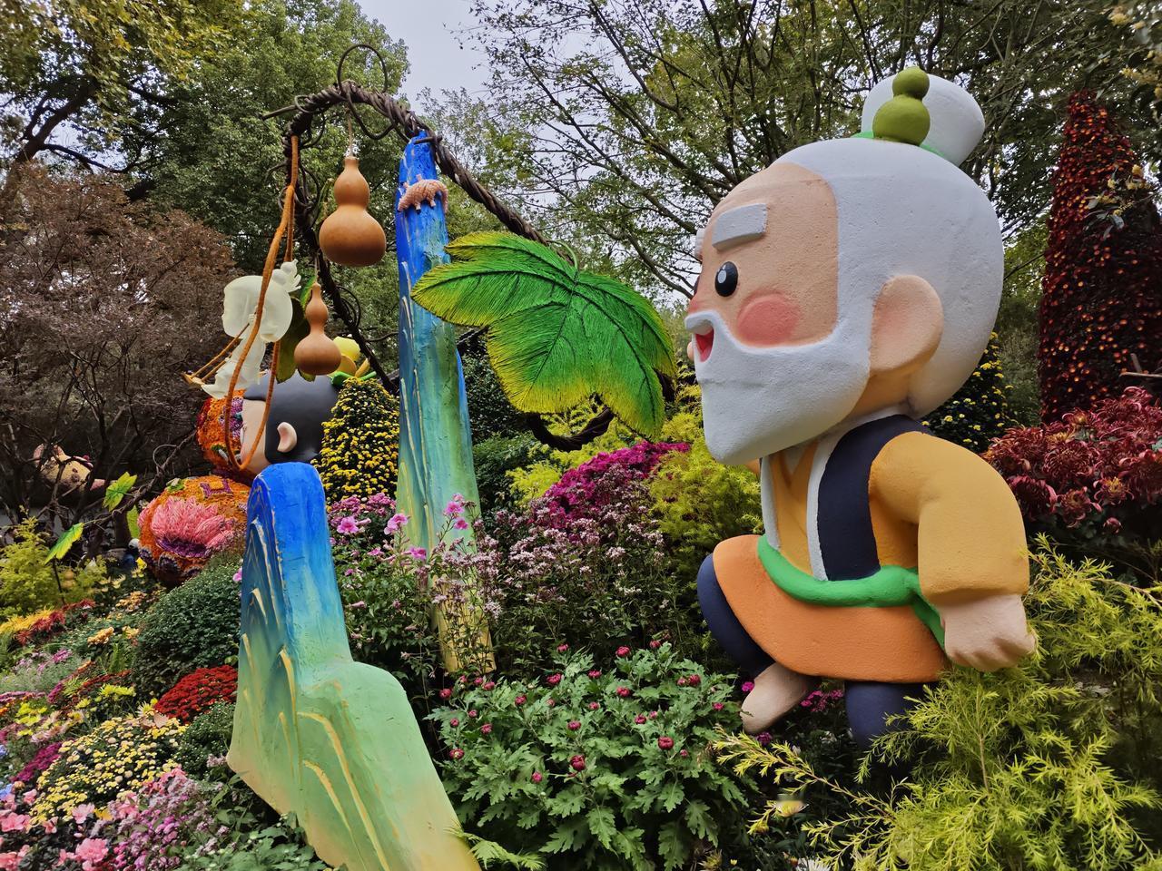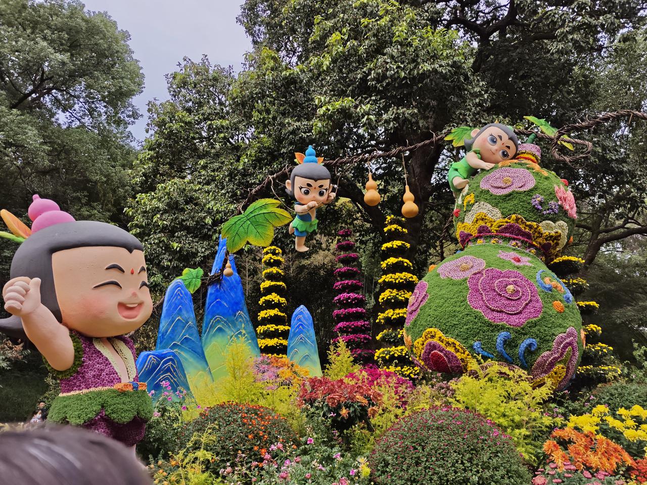我的今日状态:😁轻松愉快 我这里的天气:☁️阴天 每年看菊花展已经成了杭州人的习惯,无论是年轻人还是坐轮椅的耄耋老人,都兴致勃勃观看着各种造型的菊花展。 我穿梭在热闹的人群中享受菊花展变身童话乐园的乐趣,眼前的《葫芦童忆》造型瞬间把我的思绪拉回了童年记忆。