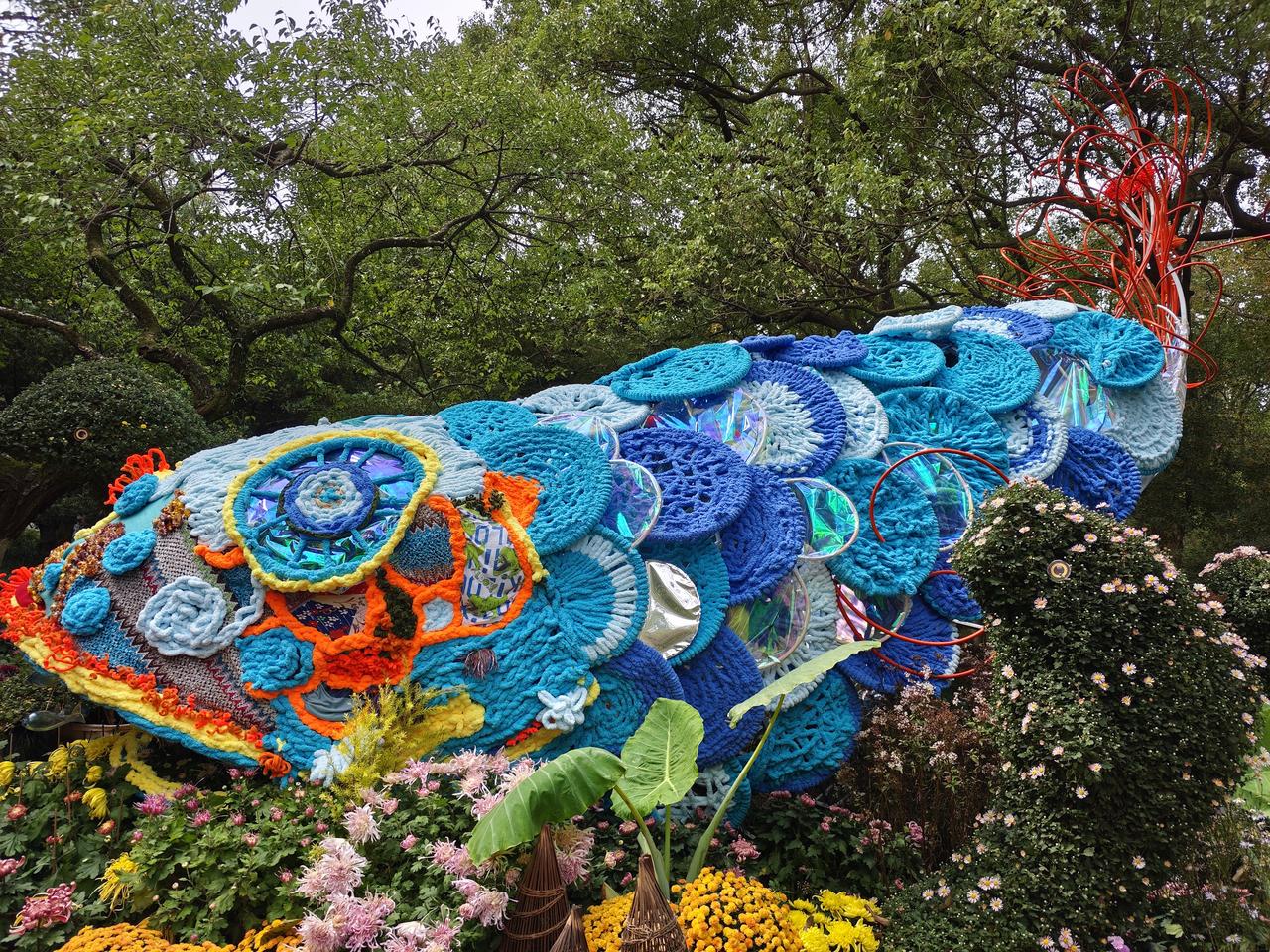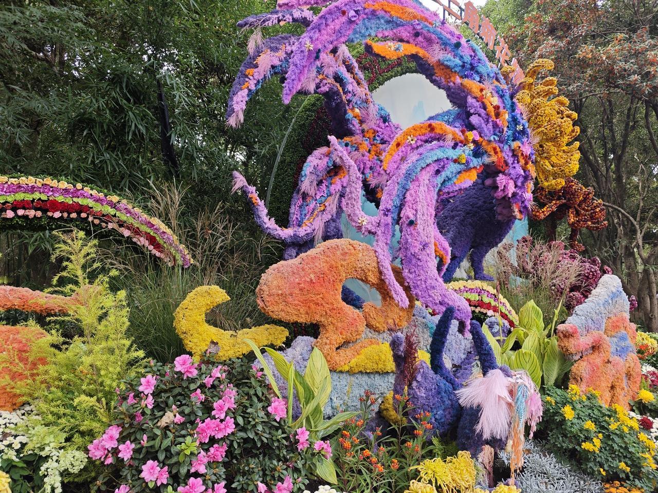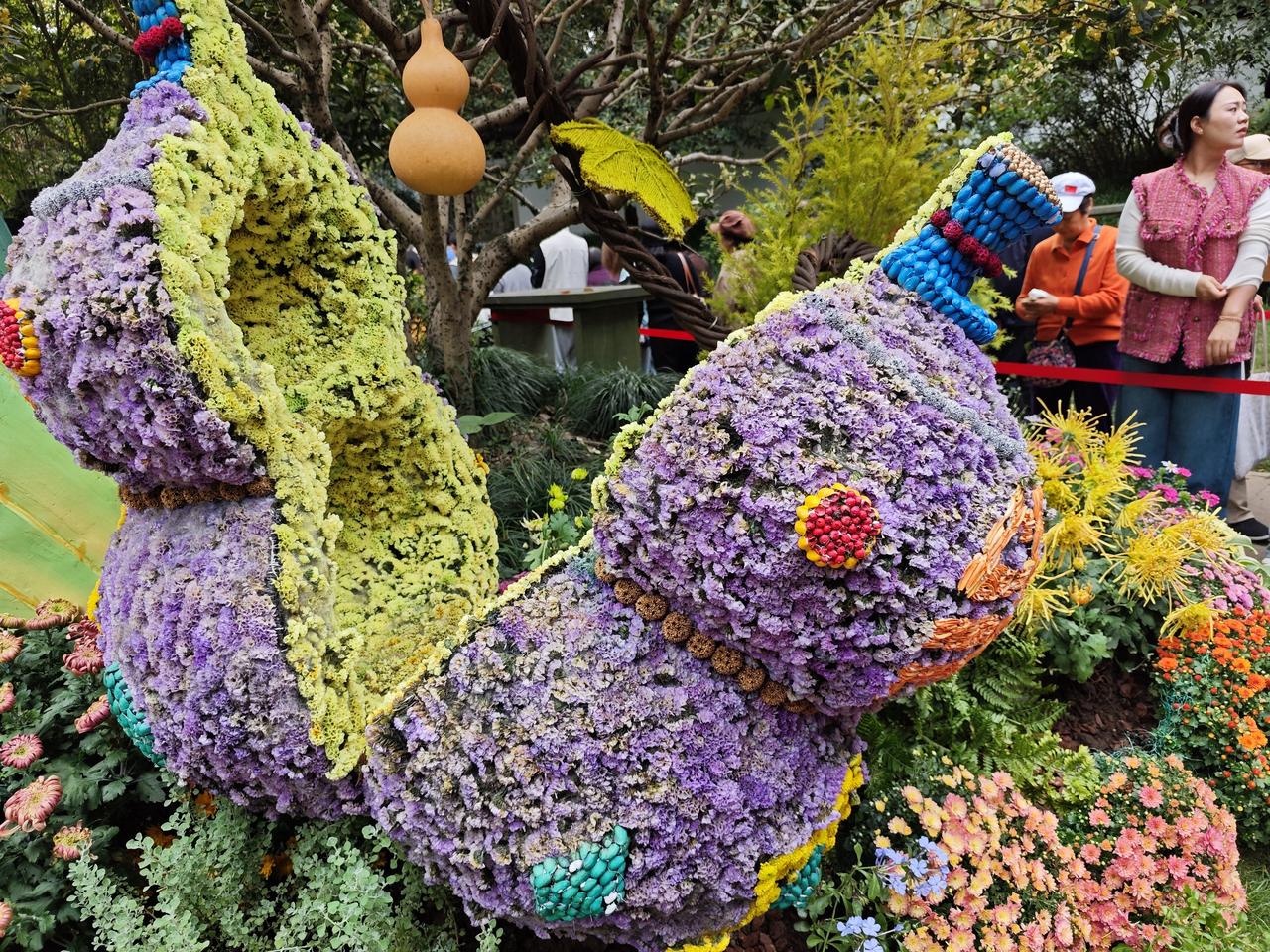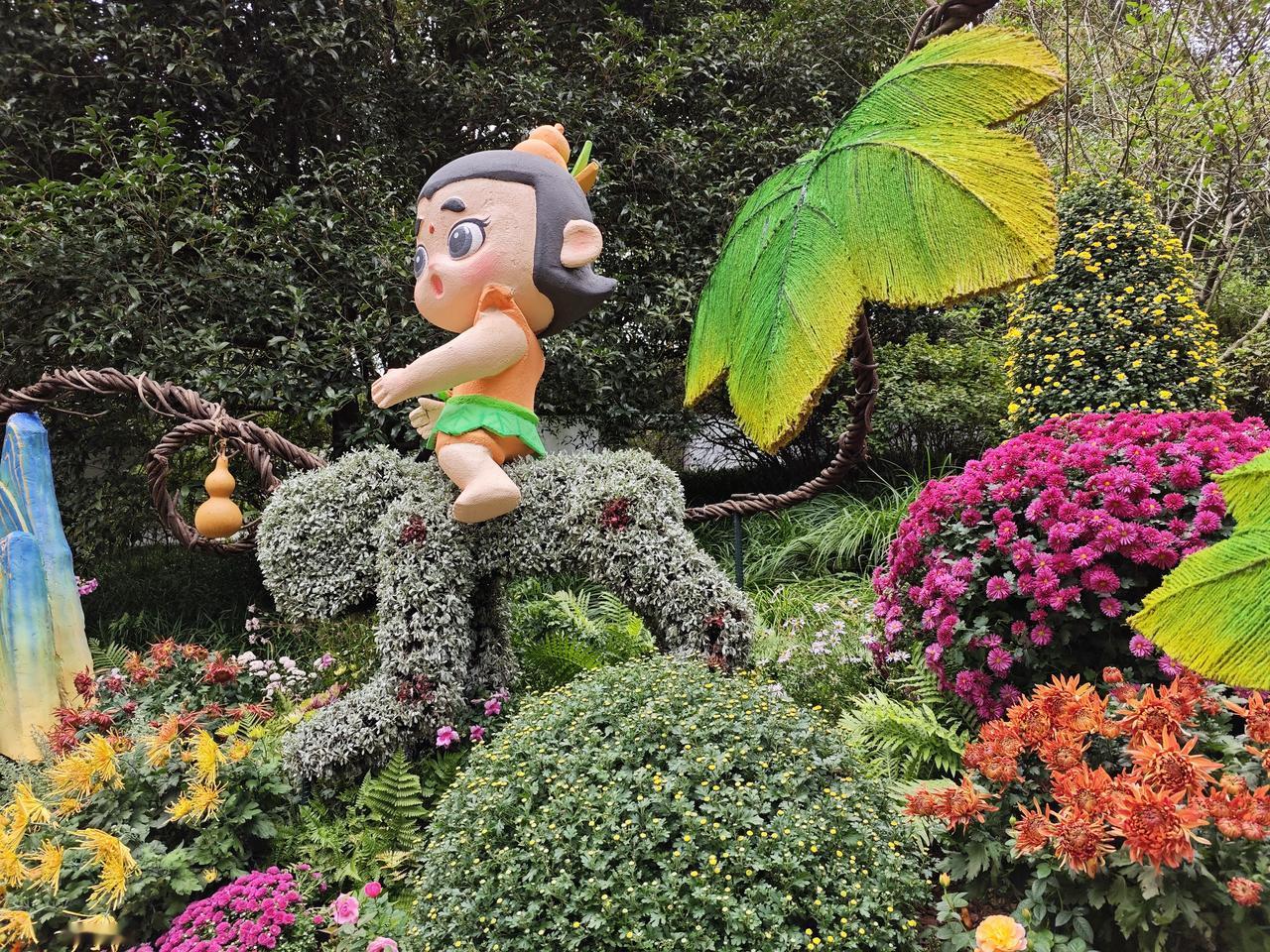 我的今日状态:😁轻松愉快 我这里的天气:☁️阴天 每年看菊花展已经成了杭州人的习惯,无论是年轻人还是坐轮椅的耄耋老人,都兴致勃勃观看着各种造型的菊花展。 我穿梭在热闹的人群中享受菊花展变身童话乐园的乐趣,眼前的《葫芦童忆》造型瞬间把我的思绪拉回了童年记忆。