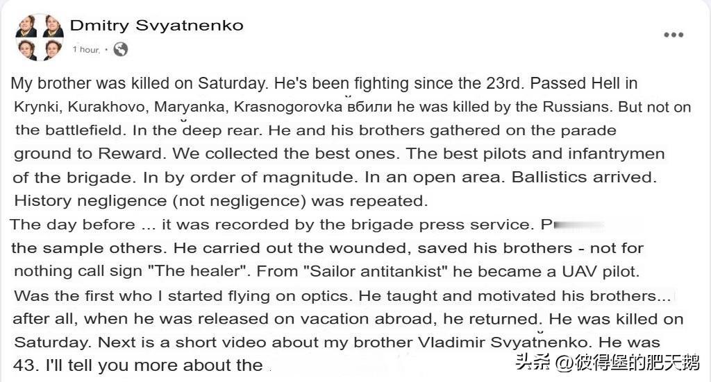 德米特里・斯维亚滕科:我的兄弟在后方阅兵场遭袭身亡。 我的兄弟周六牺牲了。他从2023年起就一直在战斗,在克林基、库拉霍沃、马林卡、克拉斯诺戈罗夫卡浴血奋战,不是在战场上被俄军杀死的,而是在大后方。 他和战友们在阅兵场集合,准备接受嘉奖。我们选出了最优秀的人 —— 旅里最出色的无人机操作员和突击步兵,在一个开阔地带,按军衔顺序列队。然后弹道武器(伊斯坎德尔-M)袭来。历史上的疏忽(绝非偶然)再次上演。 前一天…… 旅新闻处还记录了他的事迹,作为模范典型宣传。他抢救伤员、营救战友 —— 正因如此,他的呼号是 “治愈者”。他从 “反坦克水兵” 转型为无人机飞行员,是我们中第一个掌握光学侦察飞行的人。他教导并激励战友…… 而且,即便获批出国休假,他也选择了返回前线。 他上周六牺牲了,年仅 43 岁。接下来是一段关于我兄弟弗拉基米尔・斯维亚滕科的短视频。关于葬礼的细节,我之后再细说。 看来,这应该就是乌军东方集群指挥部提到的同一件事了,事发于第聂伯罗彼得罗夫斯克州。 #俄乌冲突# ##俄罗斯飞行员又来进货了#