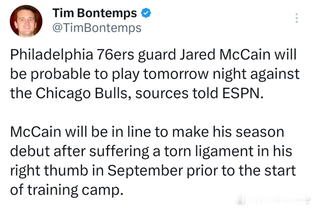 魔仙哥麦凯恩即将复出!76人后场深度再增强!
