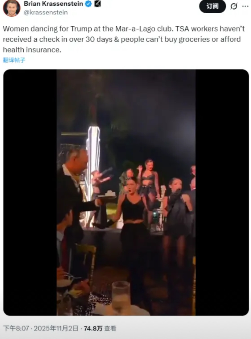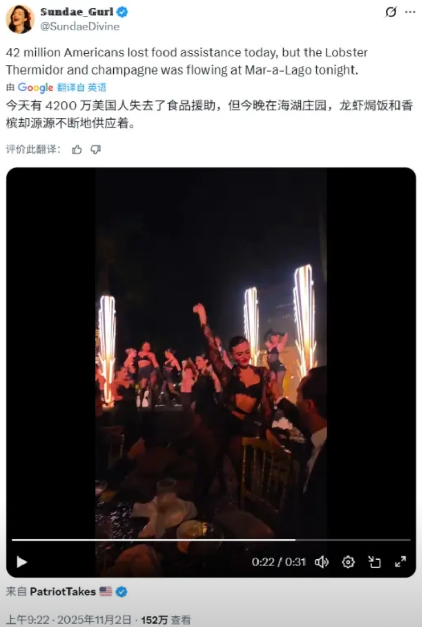 川普在海湖庄园举行万圣节派对,现场名流大咖齐聚一堂,应招女郎激情热舞,而与此同时,美国政府已经停摆30多天了,因为政府关门,食品券计划的资金耗尽,约4200万美国人失去了食品援助,他们即将面临饿肚子的情况。 这一刻,朱门酒肉臭,路有冻死骨的情景具象化了。 但其实你知道吗? 美国人接受这一切,美国人想要的自由,就是你政府别管我的自由,我爱干啥干啥,杀人放火贩毒,只要我能发财,我的钱财我就可以随便挥霍,做一切违法的事情,做一切离经叛道的事情。这是美国人理解的自由,所以富人发财,富人挥霍,美国人会想着,有一天我发财了,我也可以为所欲为。 但这种自由,在中国就不行,中国人讲究“达则兼济天下”,你有钱了,你要给社会做贡献,你还是只能娶一个老婆,你还是有很多红线,所以,很多有钱人都往国外跑,因为他们觉得不自由。 如此对比一下,中美两国的建国理念就是不同的,中国这种机制,类似于无情的国家机器,能一直运转,而美国那种机制,就是富人天堂,富人垄断,底层人永远没有出路。 所以,美国才有那么多暴力,仇杀,犯罪,一切的一切,都是垄断集团造成的,特朗普就是这里面最大的垄断分子之一!