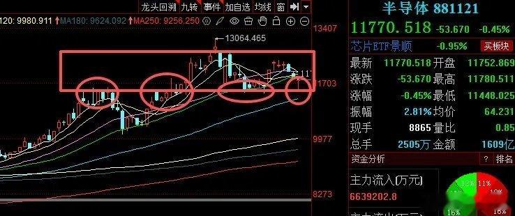 在昨天盘中给大家画出来,半导体下方有很强劲的箱体下轨做支撑,如下图,从昨天半导体指数收出长下影线也可以看出,箱体下轨附近有很强的支撑和资金承接力。