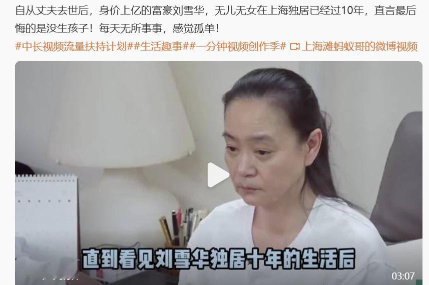 节目中,有人问刘雪华最大的遗憾是什么?她说是无儿无女,每天无所事事,感觉孤单!虽然身家亿万,但自从丈夫去世后,在豪宅独居十年之久刘雪华由衷感慨太孤独了,甚至担心自己年龄大了,有一天摔在地上都没有人知道。   刘雪华如今65岁了,上海的家是她一手打理的港湾,三室一厅,宽敞得能回荡脚步声。   她从早到晚不关电视,不是因为爱追剧,而是那嗡嗡的声音,像个不请自来的客人,填补空荡荡的房间。   丈夫邓育昆走后,这些年她就这么守着,日子过得井井有条,阿姨来做饭,司机帮着跑腿,两只狗狗是她最贴心的伙伴。   可她自己说,这日子虽稳当,却总有种说不出的空落,年轻时,她是荧屏上的眼泪皇后,演尽了悲欢离合的角色,谁想得到,戏外的人生,也会演成一出独角戏?   她不爱出门,智能设备对她来说像外星玩意,不会点外卖,不会刷短视频,偶尔和姐姐通个电话,就算是最大的社交了。   这样的生活,听着自由,却也透着无奈,尤其是当她想到,万一哪天身体出点岔子,摔一跤或者心口堵得慌,谁第一个知道?   这不是刘雪华一个人的独白,而是无数独居长者的心声,社会变迁快得像高铁,年轻人追着城市里的机会跑,家庭结构碎成一盘散沙,老人留守的越来越多。   不是他们不想热闹,而是时代推着大家往前,儿女远在天边,邻里间也少了这份旧时熟络。   孤独这东西,不光是没人聊天那么简单,它像慢性毒药,慢慢渗进骨头里,研究那些专家的话,他们说,独居本身不算大祸根,关键是那股“孤立感”,它会放大一切小毛病,让人觉得世界大而自己渺小。   心理上,长期没人分享喜怒哀乐,情绪就容易卡壳,变成低落、焦虑,甚至对日子提不起劲。   身体上更棘手,安全隐患到处是:厨房的火没关,夜里起床上厕所滑一跤,门外敲门的陌生人说不定就是个骗局。   这些年,社区资源多了起来,日间护理中心、科技手环能叫急救,紧急网络拉近了距离,可对很多人来说,这些工具再聪明,也比不上一个热腾腾的饭具,或者一句“爸妈,我回来了”。   孤独的根子,不全在独居上,更在社会那张网织得太松散,我们常说“养儿防老”,可现实是,儿女忙事业,孙辈忙学业,老人成了家庭里的“隐形人”。   刘雪华有钱有名,豪宅里塞满回忆,可她还是会感慨无儿无女是最大遗憾,这话听着心酸,却戳中要害——孩子不只是传宗接代,更是晚年那盏不灭的灯,没了它,日子就容易滑向灰色地带。 社会支持本该是缓冲带,朋友圈子小了,社区活动少点,老人就容易陷进去,农村的更难,城市虽热闹,老人却像岛屿,围着高楼却摸不着边。   想想那些报告,丧偶的、独居的,孤独感来得最猛烈,因为它不只缺人,还缺根,家庭功能弱了,经济压力一顶,健康小恙一出,情绪就崩盘。   专家们直言,这不是个人问题,是全社会的大考,忽略了,就等于在挖养老的墙角。   刘雪华的日子,就在这样的小圈子里找平衡:狗狗的撒欢,姐姐的絮叨,偶尔的工作邀约。   这些年,她没急着再婚,但对感情敞开心扉,说世上不会再有第二个邓育昆,却也不关上门。   你怎么看?