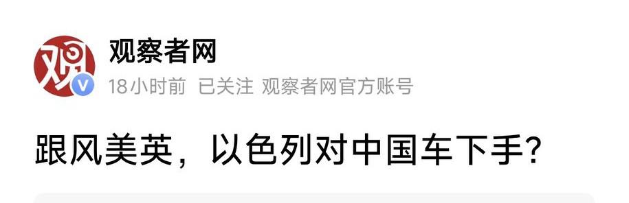 跟风美英,以色列对中国车下手? 以色列这波操作真是让人摸不着头脑。11月2日多家以色列媒体爆料,以色列国防军以“信息安全风险”和美国不满为由,下令全面替换军官用的中国汽车,招标也剔除中国品牌。《今日以色列报》还炒作中国车智能系统“可能监控或数据泄露”。 这禁令分阶段实施,到2026年一季度末扩大到所有军官,约700辆车受影响,大多是奇瑞车。此前中国车就已被禁止进军方基地。 要知道,中国新能源车在以色列民间卖得超火,2025年前5个月销量可观。以色列之前还采购超600辆中国车用于公务。以色列这明显是跟风美英,搞无端打压,实在是贼喊捉贼! 带定位晒今日生活 我的今日状态:😁轻松愉快 我这里的天气:☀️晴天