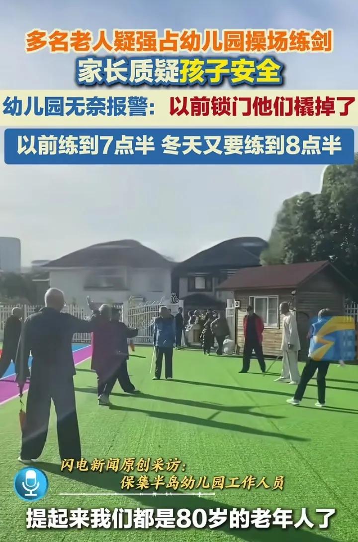 “这是坏人变老了?”江苏扬州,一群老人占用幼儿园操场练剑,不锈钢的刀剑有一米长,