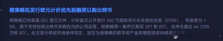 微策略已向美国 SEC 提交文件,计划首次公开发行 350 万股欧元计价永续优先股(STRE),年股息为 10%,用于支持包括比特币采购在内的公司运营。