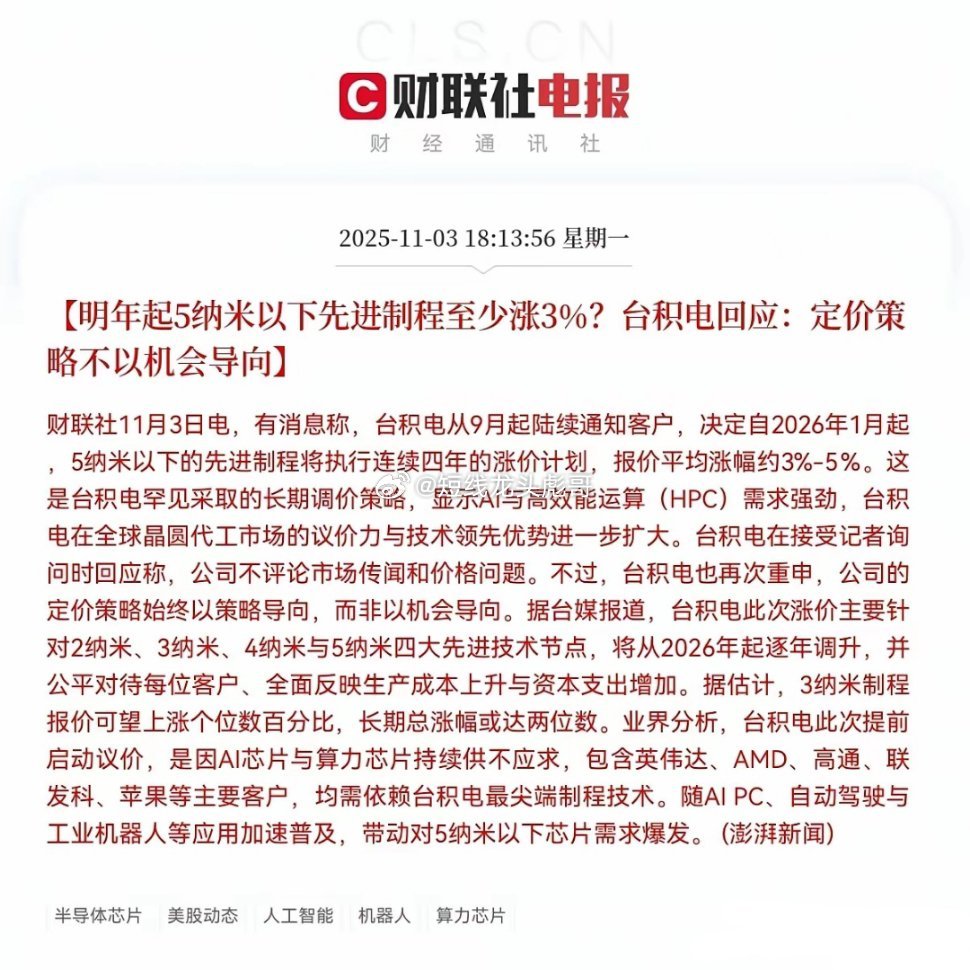 重仓半导体芯片的投资者们,今天有望再迎喜悦!据财联社最新消息,台积电已陆续通知客户,自2026年1月起,5纳米及以下先进制程芯片将至少涨价3%。业内分析认为,这主要源于AI芯片与算力芯片持续供不应求,加之AIPC、自动驾驶、工业机器人等应用的快速普及,推动5纳米以下芯片需求大幅增长。