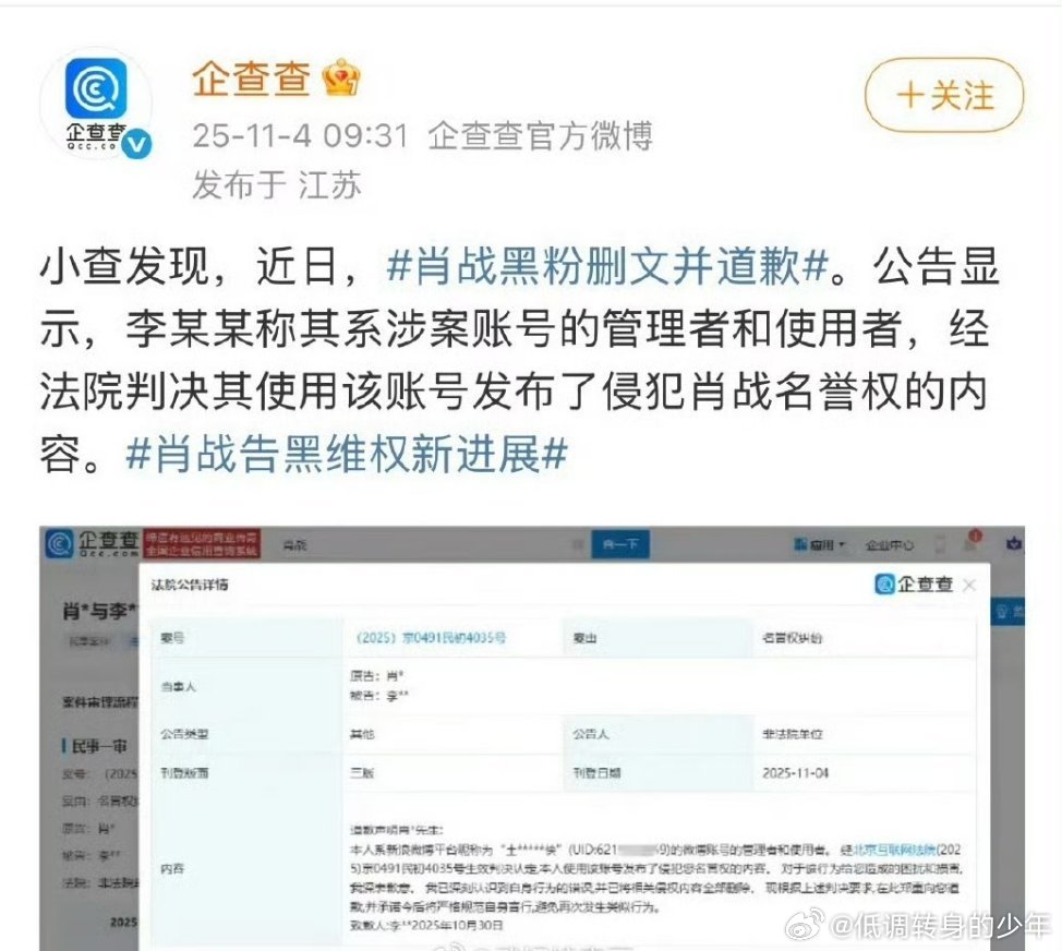 侵权肖战黑粉公开道歉又一个,这是一天一个的节奏!恭喜肖战又一次告黑成功,黑粉删文并道歉,网络并非法外之地,支持肖战依法维权!