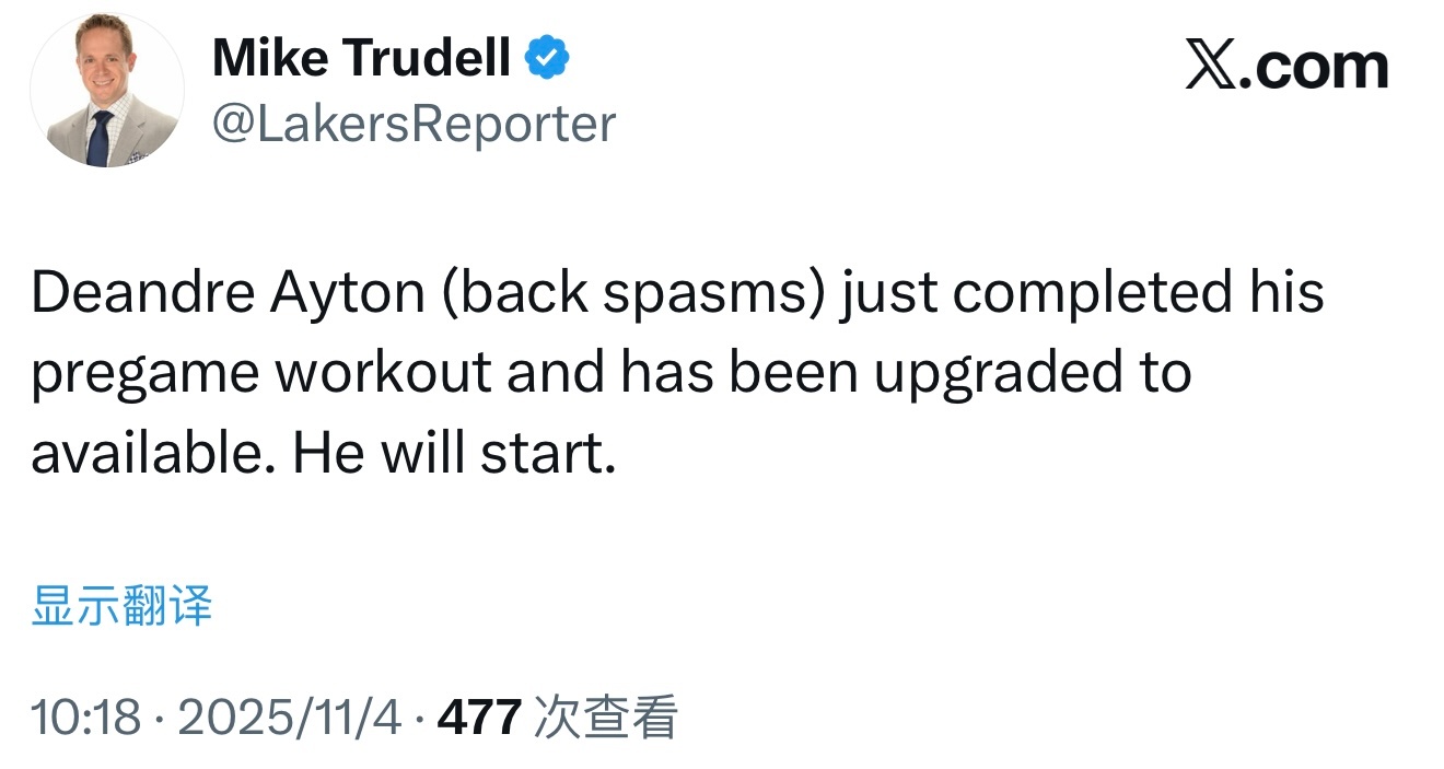 艾顿今天可以打,首发出战!克勒贝尔依旧缺席!