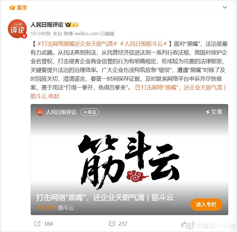 昨天人民日报专门发了一篇评论,针对网络“黑嘴”下场开锤,你仔细看看就会发现,虽然没有明着提某家公司,但字里行间说的都是小米的遭遇。我觉得有一句说得非常好:面对“黑嘴”,法治是最有力武器。当你遭遇到不公的待遇,只有拿起法律武器,狠狠打痛水军和黑公关背后的坏人,他们才会投鼠忌器,不敢再放肆。