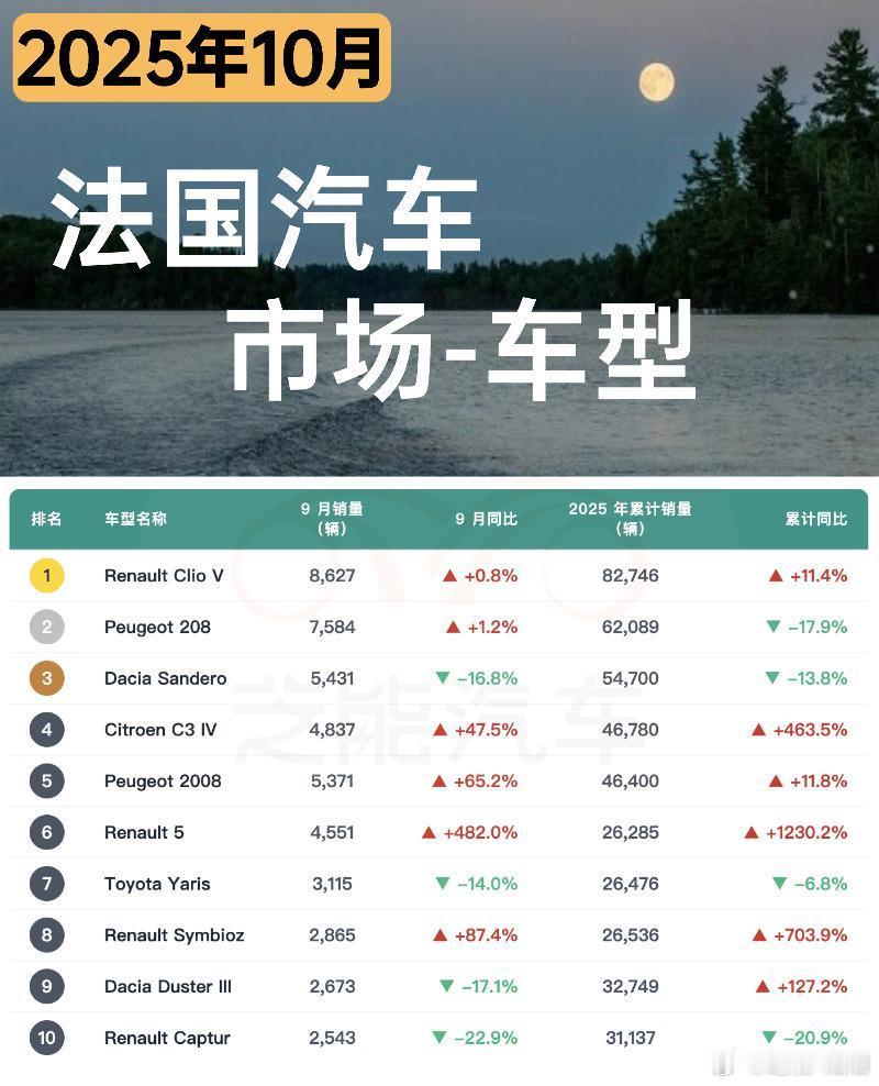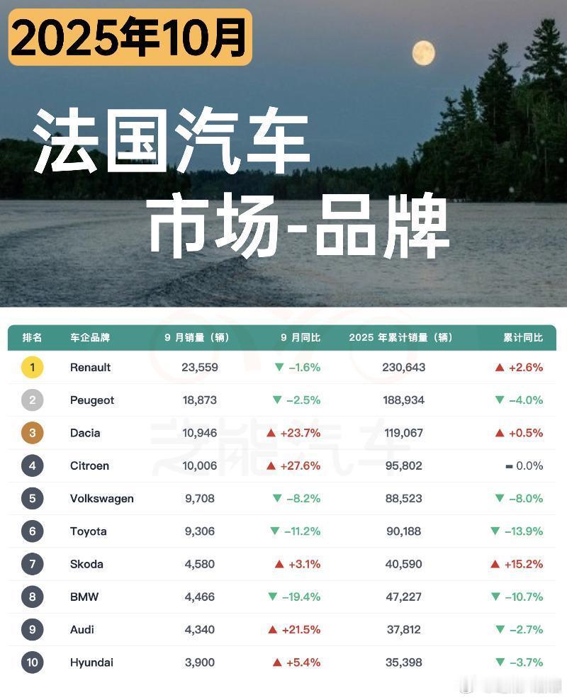 2025 年 10 月法国新车市场连续三月增长,但仍低于疫情前水平。纯电车型占比创新高,成为市场增长核心,混合动力车型维持主导地位,燃油车持续萎缩。