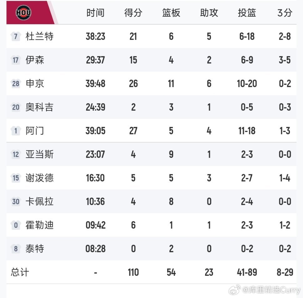 阿门汤普森27分,申京26分11篮板,杜兰特21分6篮板
