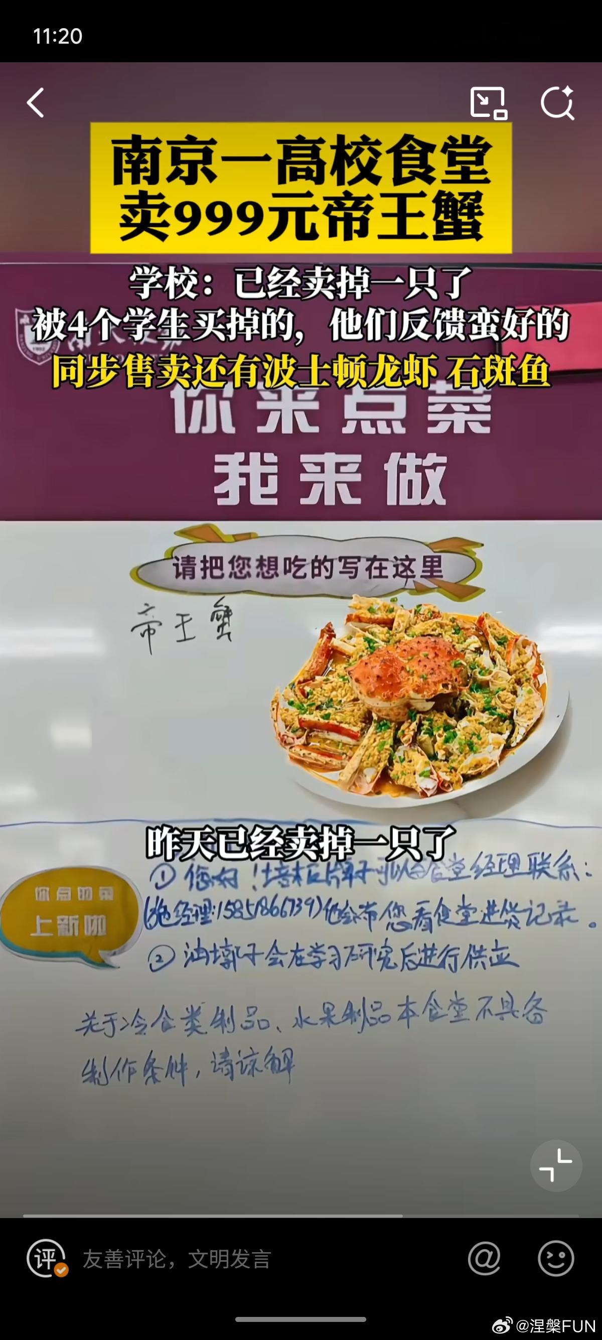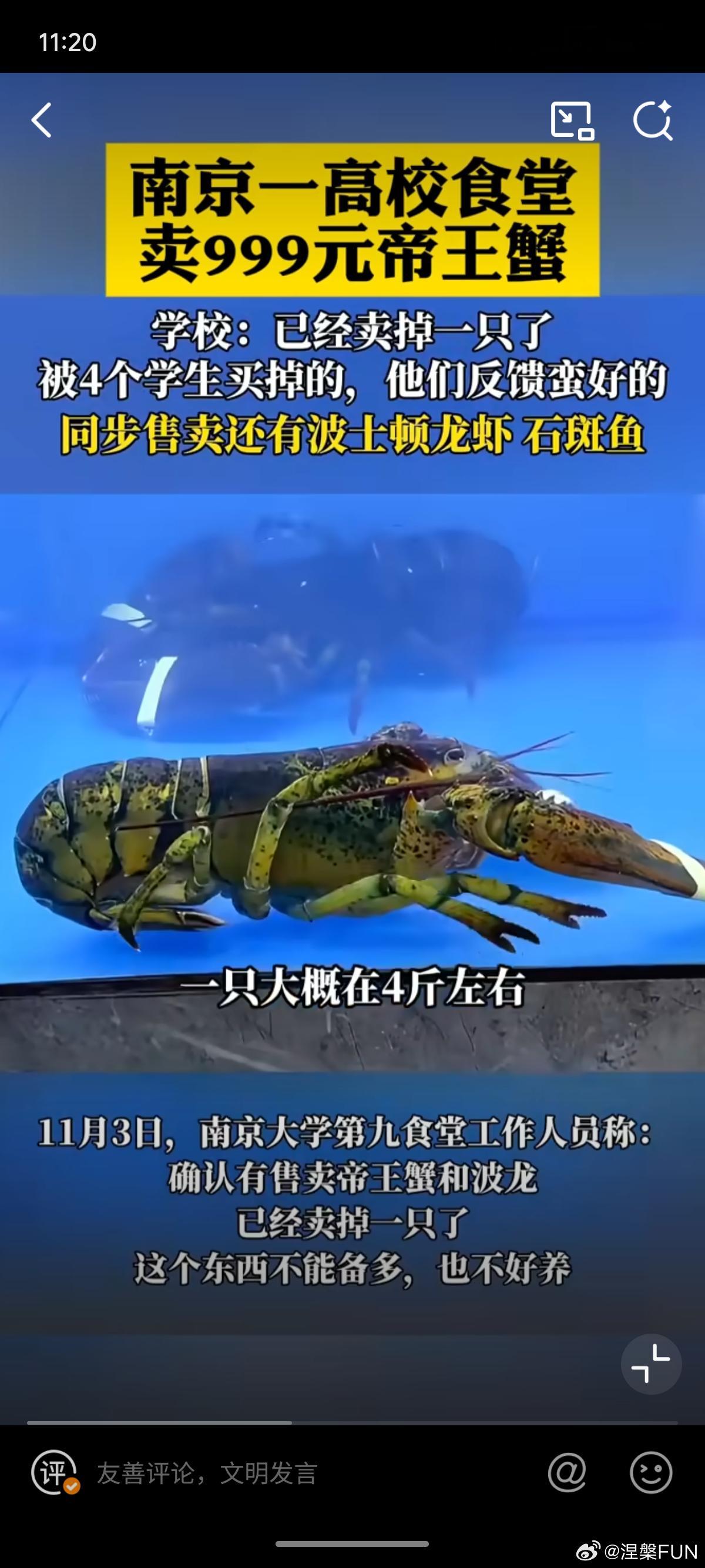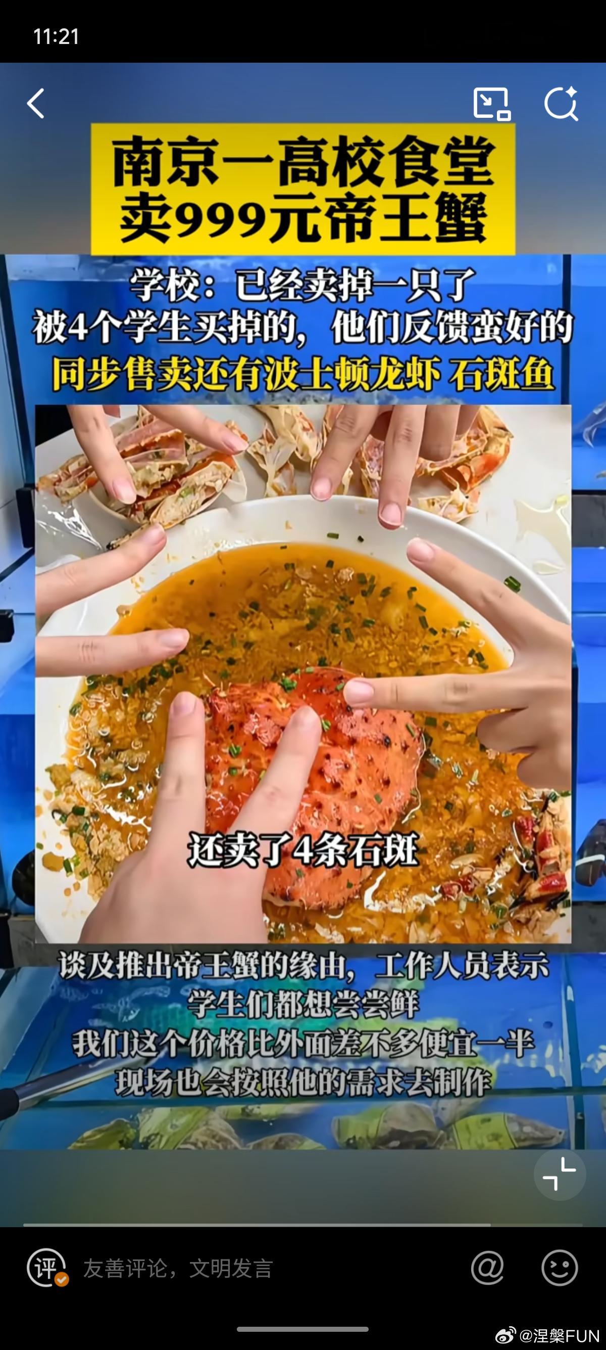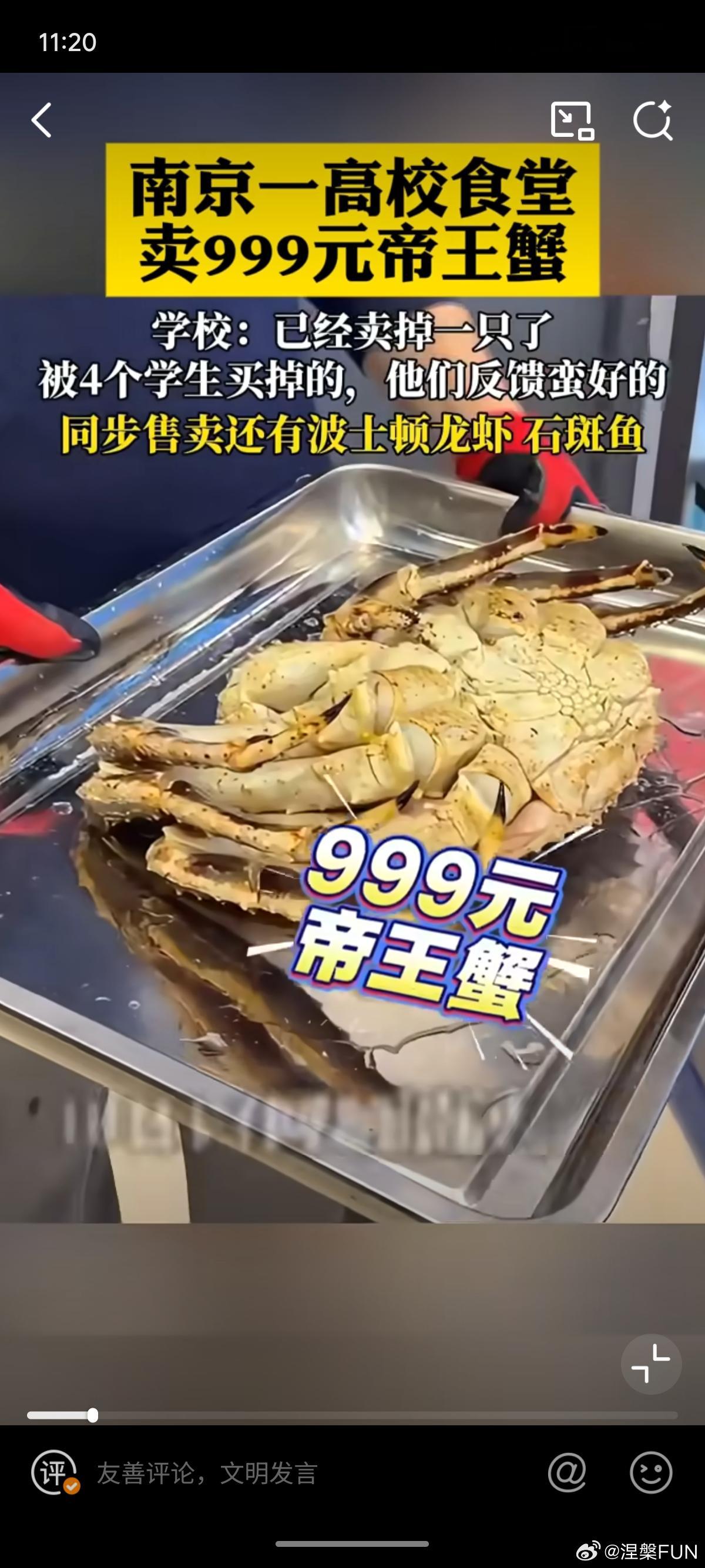 南京大学通报食堂卖999元帝王蟹我觉得大学食堂卖帝王蟹也没有啥不妥,有钱就吃,没钱就不吃,老师也可以吃,没人吃也就会不会再弄。大学现在也不是不食人间烟火,出来工作了就知道了社会有有钱人,自己学好知识,努力工作,吃帝王蟹没有不可能。现在大学生也很会赚钱的,早几年就有学软件学生,开自己买的车去上课。