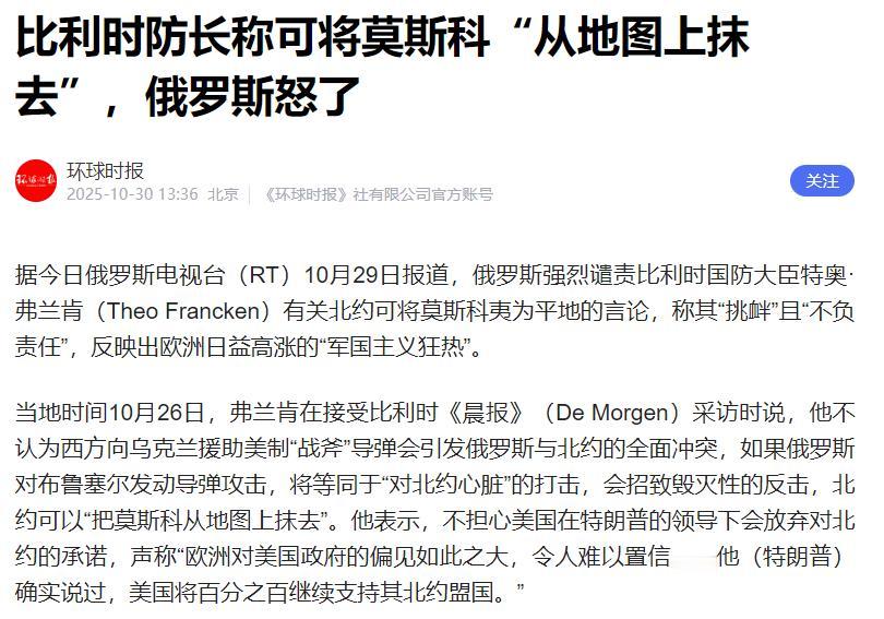 比利时放话要让莫斯科在地图上消失,然后其空军基地就在24小时内两次遭到神秘无人机的光顾!   这事儿得从10月26日说起,当时比利时的国防大臣特奥·弗兰肯在接受本国《晨报》采访时,针对西方向乌克兰援助美制“战斧”导弹的问题明确表态,称此举不会引发俄罗斯与北约的全面冲突。   他甚至放出狠话,要是俄罗斯敢对布鲁塞尔发动导弹攻击,就等同于“打击北约心脏”,北约必将展开毁灭性反击,有能力“把莫斯科从地图上抹去”。   弗兰肯或许也是觉得自己说的话太过了,没过几天便又出面澄清,说自己的话被媒体恶意曲解了,实际是想强调北约的威慑原则,并非真要扬言摧毁莫斯科,但也表示“不会收回任何一个字”。   俄罗斯这边则根本不吃这一套,据俄媒10月29日报道,俄罗斯也已作出强烈回应,副外长亚历山大·格鲁什科直言,弗兰肯的言论尽显西欧盛行的“军事狂热氛围”。   俄罗斯驻比利时大使馆更是发表声明,痛斥这番言论“挑衅且不负责任”,指责其“荒谬至极、脱离现实”,还警告这种言论会把欧洲大陆拖入新的战争风险。就连俄罗斯安全会议副主席梅德韦杰夫也在社交媒体上回应,称若比利时真要挑衅,“消失的会是比利时”。   谴责的话音刚落,比利时这边就出事了。10月31日夜间到11月1日,位于比利时的小布罗赫尔空军基地连续两晚遭遇不明无人机闯入,两次间隔还不到24小时。   这座基地可不是普通地方,它是北约核共享计划的核心节点,存放着美国的B61战术核弹,未来还要部署新一代F-35战斗机,战略地位极其重要。   事发后,当地警方立马出动直升机追踪拦截,可最终还是让无人机溜了踪影。比利时国防大臣弗兰肯证实了事件的真实性,透露调查人员拍到了无人机的飞行影像,但对于无人机的型号、来源,始终没能给出明确答案。   虽说目前没有确凿证据指向谁是幕后黑手,但这时间点实在太过巧合,任谁看都像是针对性给出的警告,比利时这下吃了个哑巴亏。   但说句不好听的,弗兰肯这番表态确实有些不知好歹。当前俄乌冲突的战场上,明显是俄罗斯占据优势,而北约内部都有不少想要求和的声音,持续的援助早已让不少国家倍感压力。   作为弱势一方,就算不低声下气、点头哈腰,也该清楚什么话能说、什么话不能说,主动放出“抹掉莫斯科”这种狠话,本就是自讨没趣。   而俄罗斯本就对北约持续援乌心存不满,弗兰肯的言论无疑是火上浇油。即便没有直接证据证明无人机事件与俄罗斯有关,但这种“话音刚落就出事”的节奏,已然是明确的态度——别拿狠话挑战底线。