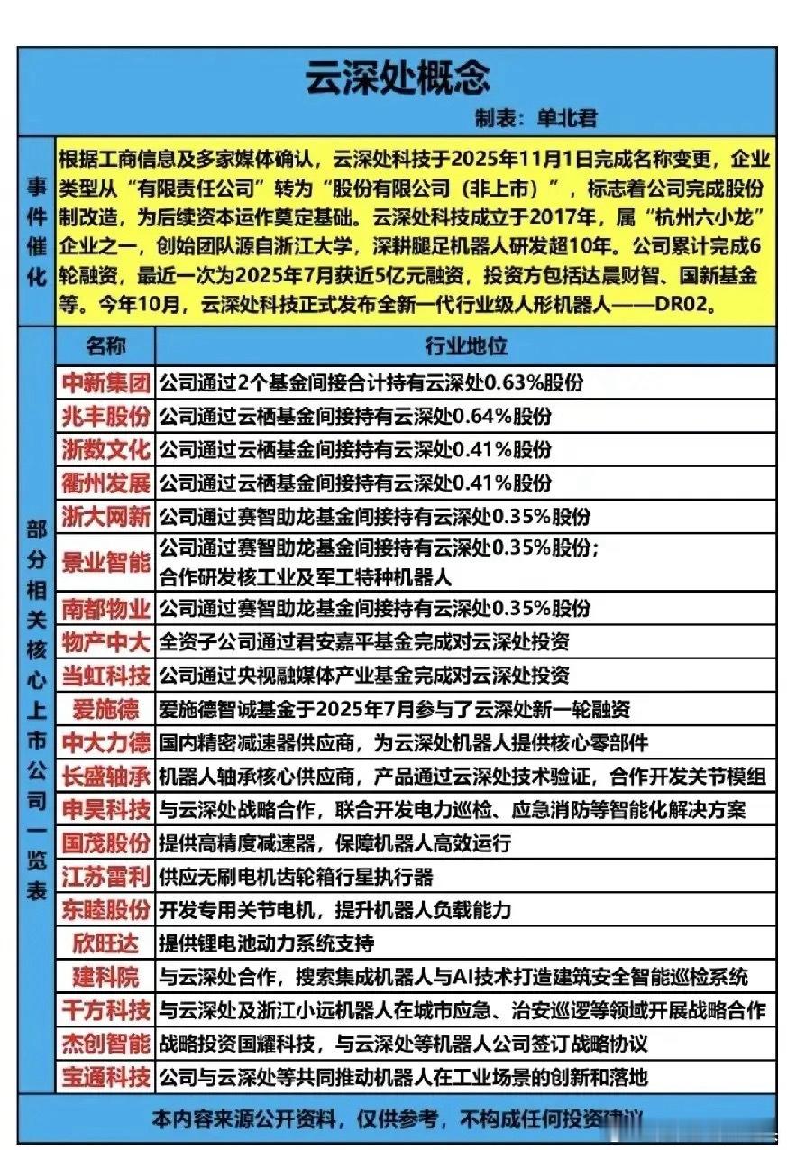 云深处科技于2025年11月1日完成股份制改造,由有限责任公司转为非上市股份有限公司,为资本运作奠基。公司成立于2017年,属“杭州六小龙”,创始团队源自浙大,深耕腿足机器人超10年,累计6轮融资,2025年7月获近5亿融资,10月发布人形机器人DR02,在人形机器人领域布局深厚,其产业链联动众多上市公司,涉及股权、零部件、场景合作等维度。