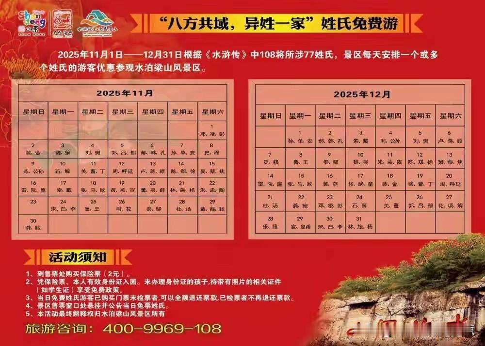 为了游客,水泊梁山景区也是拼了→11月小长假不是要来了吗? 为此,水泊梁山景区特地,安排了免票活动,根据《水浒传》一百零八将所涉及的77个姓氏,每日安排一个或多个特定姓氏游客享受免大门票优惠。 如果想来的, 不妨提前看一下今天的免票姓氏是哪位?能免咱就免嘛,对吧? 在现场,景区会公布当日的免票姓氏。 当然你也可以在网上抖音啊,微信公众号这些平台,同样可以查询。