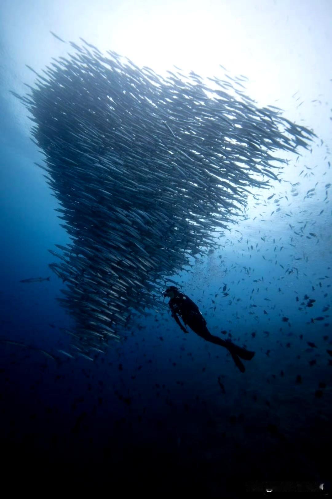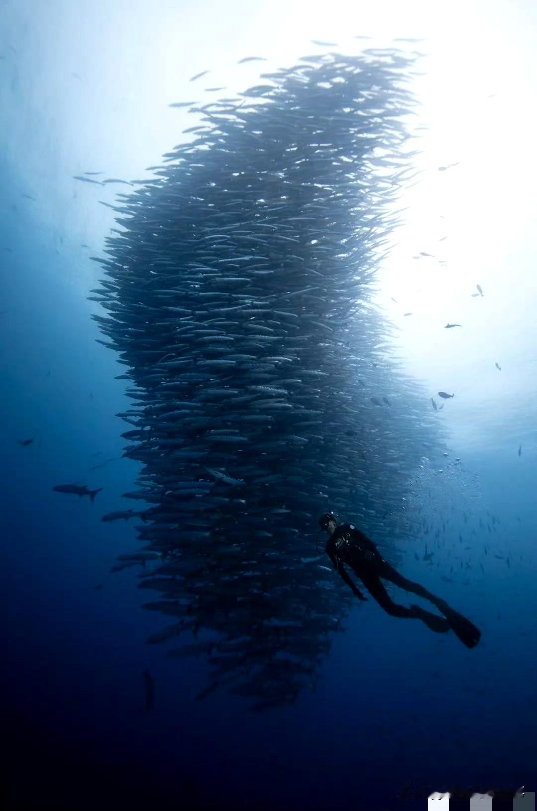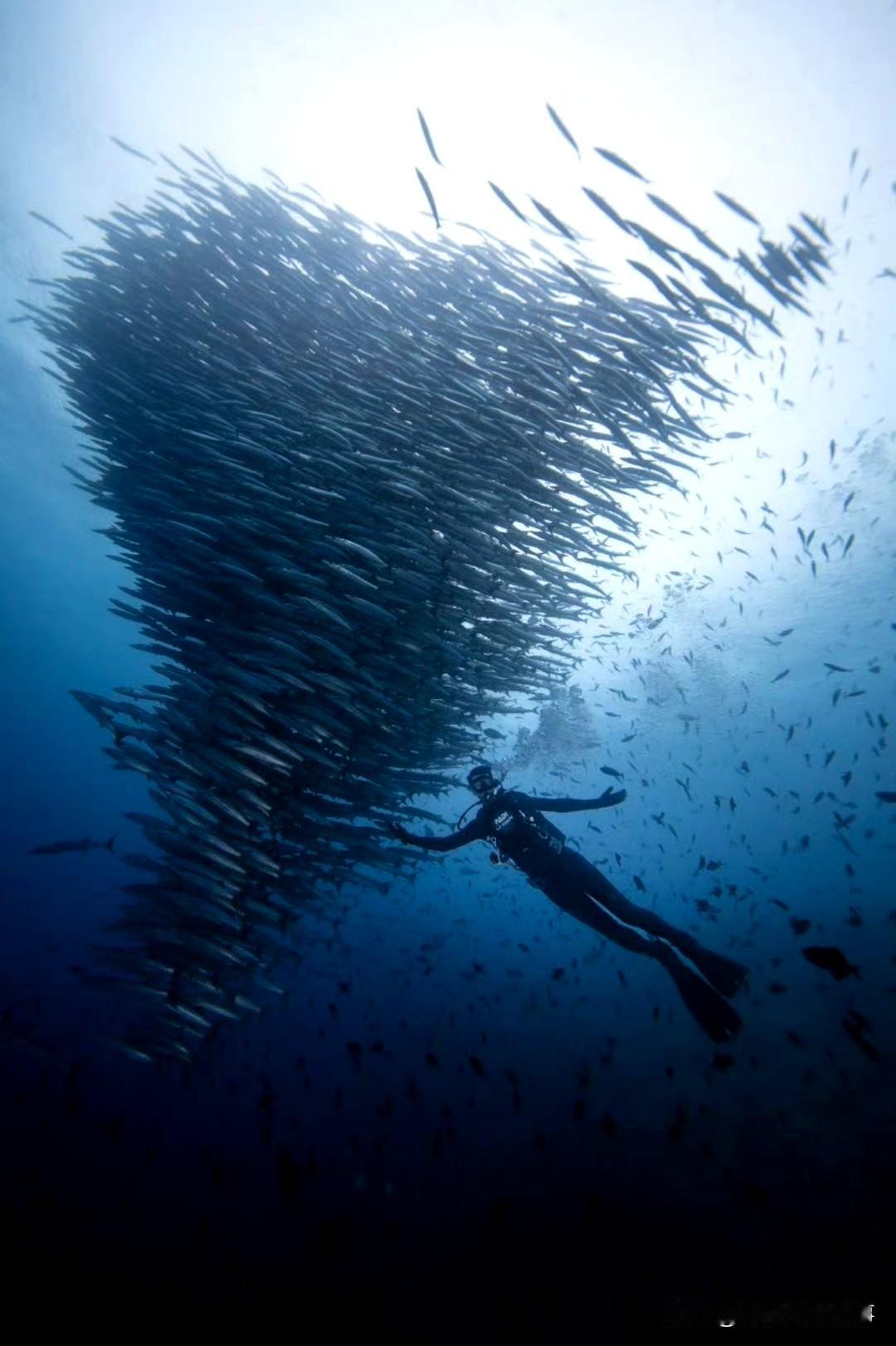 我的今日状态:😁轻松愉快 我这里的天气:☀️晴天 李现潜水遇“海狼风暴”,这画面太震撼 印尼海域的蓝调里,李现身着潜水服,闯入了金梭鱼织就的“海狼风暴”——两米长的流线型鱼群如黑色浪涛翻涌,尖牙隐在集群的阴影里。 他悬在鱼群旁,伸手的瞬间,是人类与深海野性的温柔擦肩。这一幕里,既有冒险的酷,也藏着海洋奇观的磅礴——原来“海狼风暴got it”,是把深海的震撼揣进了镜头里。