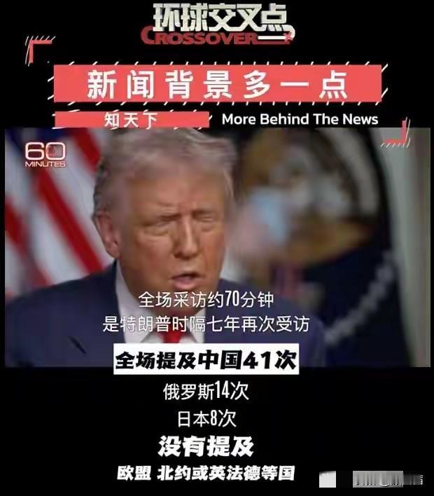 特朗普70分钟采访提了41次中国!这波左右横跳太会演了。 11月2号CBS的《60分钟》节目里,特朗普足足聊了70分钟,平均不到两分钟就提一次中国,出镜率比其他国家加起来还高。 有意思的是他的说法特矛盾,前脚夸中国稀土攒了二三十年真厉害,美国得学,后脚就说英伟达芯片绝不能给中国。 他还说中美互相是威胁,合作比“击败中国”更能让美国变强,可转头又要拉盟友搞去中国化。 这其实是美国的现实逼的,10月联邦债务破37.2万亿美元,加关税让美国家庭一年多花1200美元,农场主的大豆玉米也没了中国订单。 而中国10月升级了稀土出口管制,全球90%的精炼产量都在咱们这,美国重建产业链得15年。 特朗普这套说辞其实是演给选民看的,夸中国显懂行,说威胁煽情绪,提合作安抚企业。 咱们外交部也淡定回应,中美关系稳定才符合两国利益,毕竟他强任他强,咱们该干嘛干嘛。