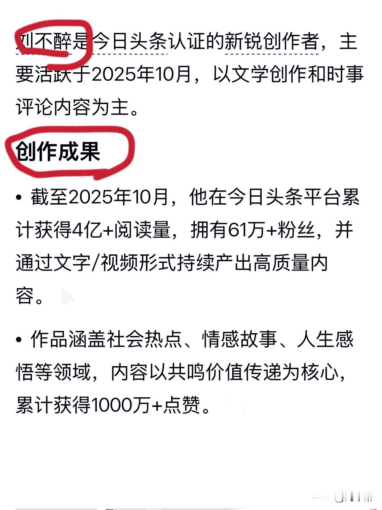 @刘不醉 头条号简介(AI生成) “刘不醉是今日头条认证的新锐创作者!” “截至2025年10月,他在今日头条平台累计获得4亿+阅读量,拥有61万+粉丝,并通过文字/视频形式持续产出高质量内容。” “作为作家协会会员,其创作聚焦现实题材,注重通过文字连接不同群体,传递社会温度……”