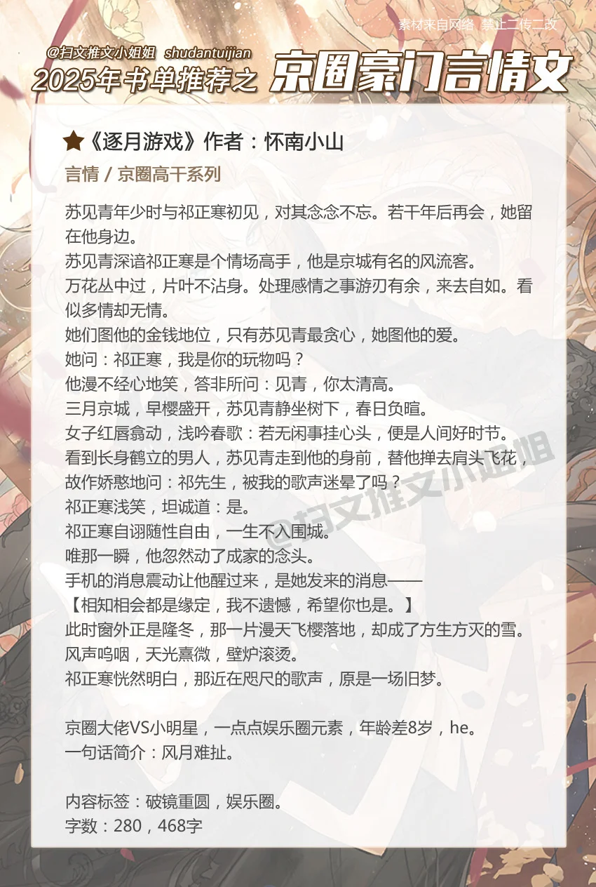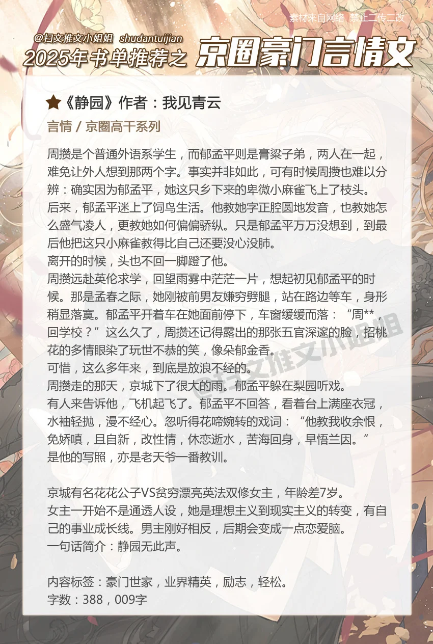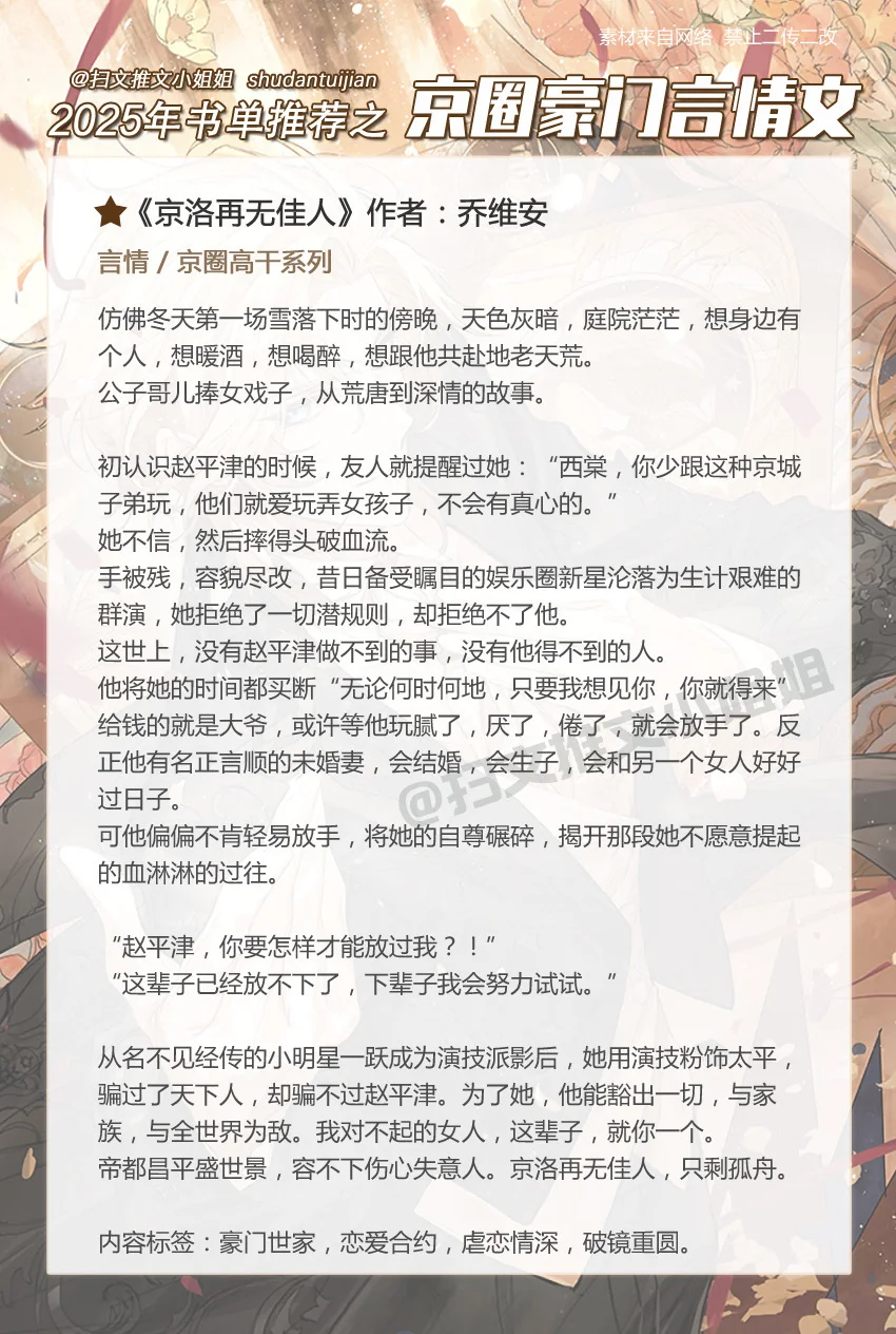 我是土狗我爱看,都是巨精彩的京圈豪门现言小说,你一定也会喜欢的! 1、《濯枝》作者:咬枝绿 2、《逐月游戏》作者:怀南小山 3、《京洛再无佳人》作者:乔维安 4、《红玫瑰》作者:半截白菜 5、《静园》作者:我见青云 6、《南北往事》作者:长宇宙 7、《隔岸观我》作者:响水 8、《度今宵》作者:飞萌 9、《孟大小 姐》作者:惘若