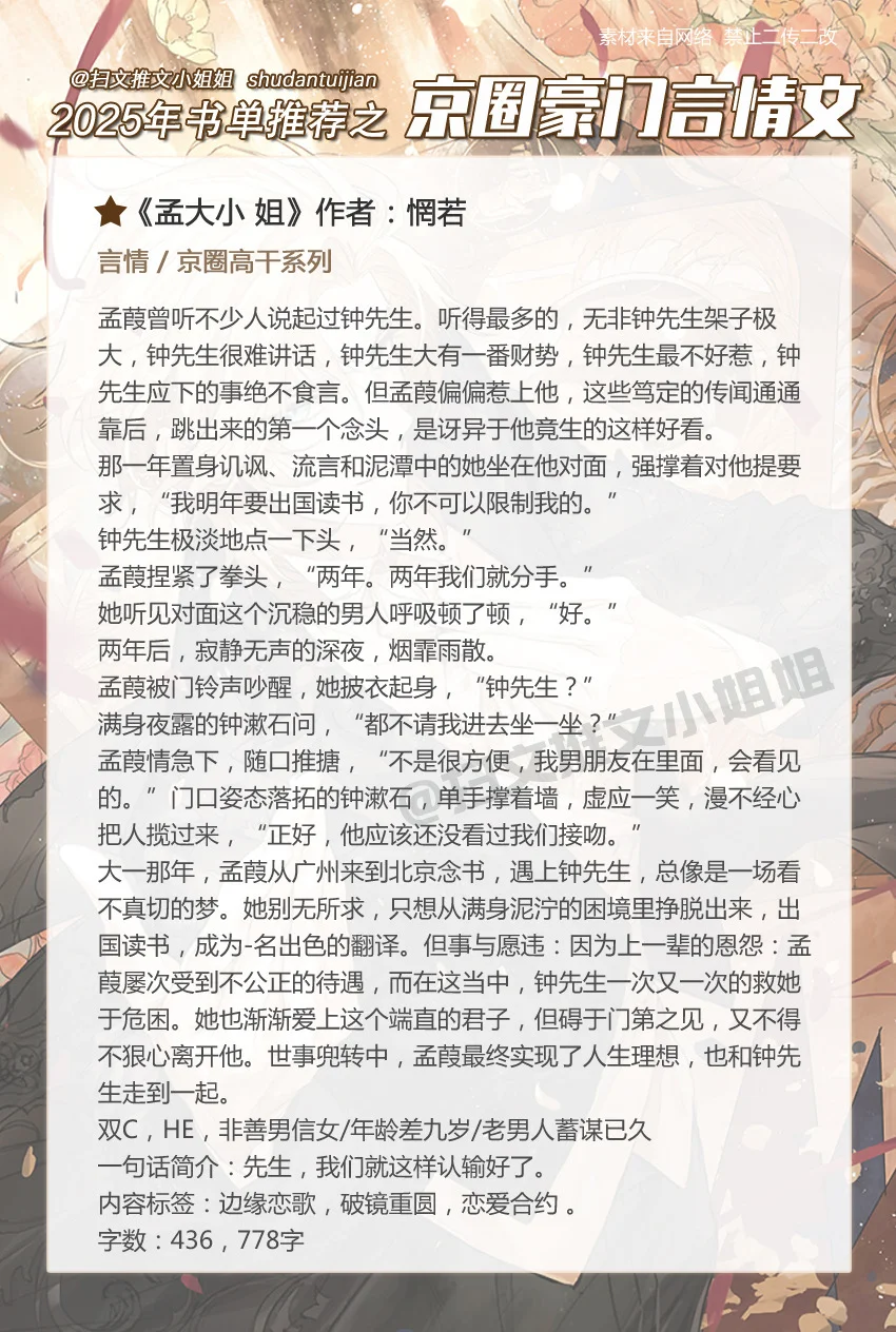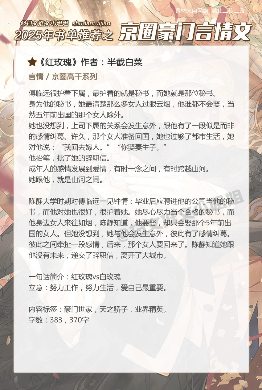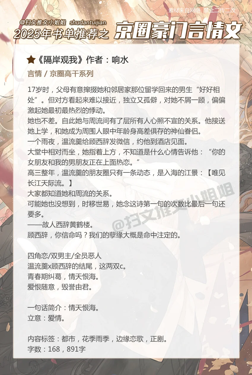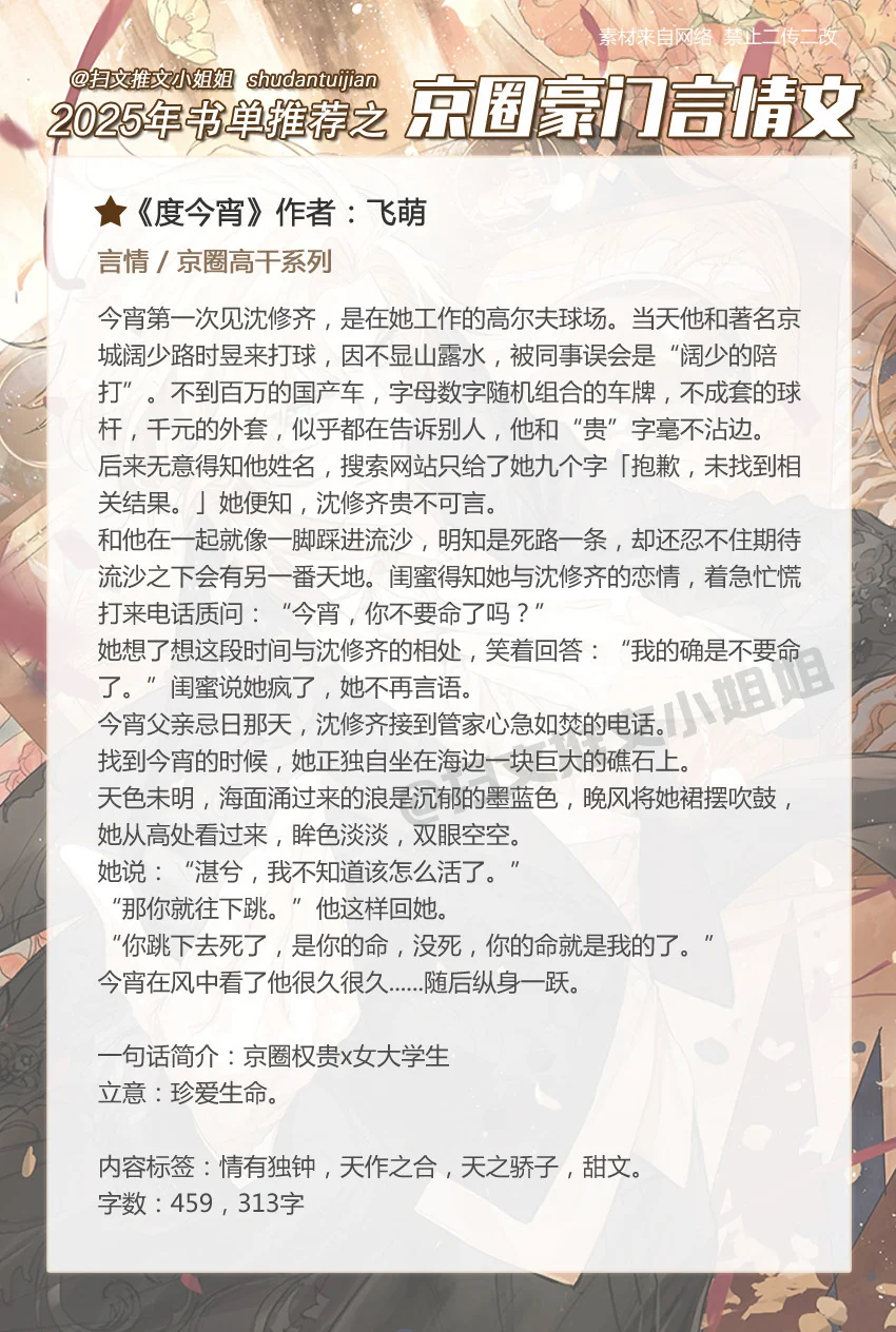 我是土狗我爱看,都是巨精彩的京圈豪门现言小说,你一定也会喜欢的! 1、《濯枝》作者:咬枝绿 2、《逐月游戏》作者:怀南小山 3、《京洛再无佳人》作者:乔维安 4、《红玫瑰》作者:半截白菜 5、《静园》作者:我见青云 6、《南北往事》作者:长宇宙 7、《隔岸观我》作者:响水 8、《度今宵》作者:飞萌 9、《孟大小 姐》作者:惘若
