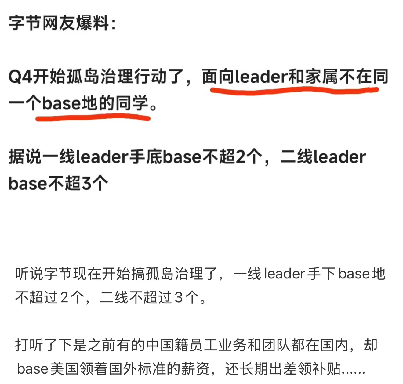 听说字节开始启动孤岛治理了,是因为有的中国籍员工业务和团队都在国内,却base美国领着国外标准的薪资,还长期出差领补贴?