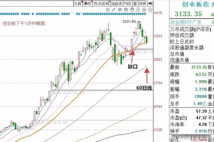 现在是下午的1:46截至目前为止,上证指数跌0.42%,深证成指跌1.61%,创业板指跌1.86%。从午后指数的表现来看,跌幅有所扩大,这也是符合莎莎昨天盘后的预判的。我们看到尤其是创业板指数,目前的跌幅已经达到了1.86%日线级别已经来到了昨天下影线的低点附近。如果今天创业板指数走出了明显实体阴线的话,那么创业板指数将会向下一个重要的支撑点靠近。而下一个重要的支撑点来自于10月24号跳空缺口的上沿,是在3082点附近。那如果要到达这个点位的话,还有比较明显的调整空间。当然,如果这个位置,明天创业板他果然到了缺口的位置,那么这个时候就不排除创业板指数,会向下去寻找60日线的支撑。所以大家明白了没有?指数连续上涨之后,市场它是需要进行震荡洗盘操作的。只有震荡洗盘结束了,才能够展开新一轮的上涨。而在洗盘没有到位之前。大家一定要保持耐心。这就是为什么昨天以及今天早上,我连续发文告诉大家,不要去抄科技的底的原因。