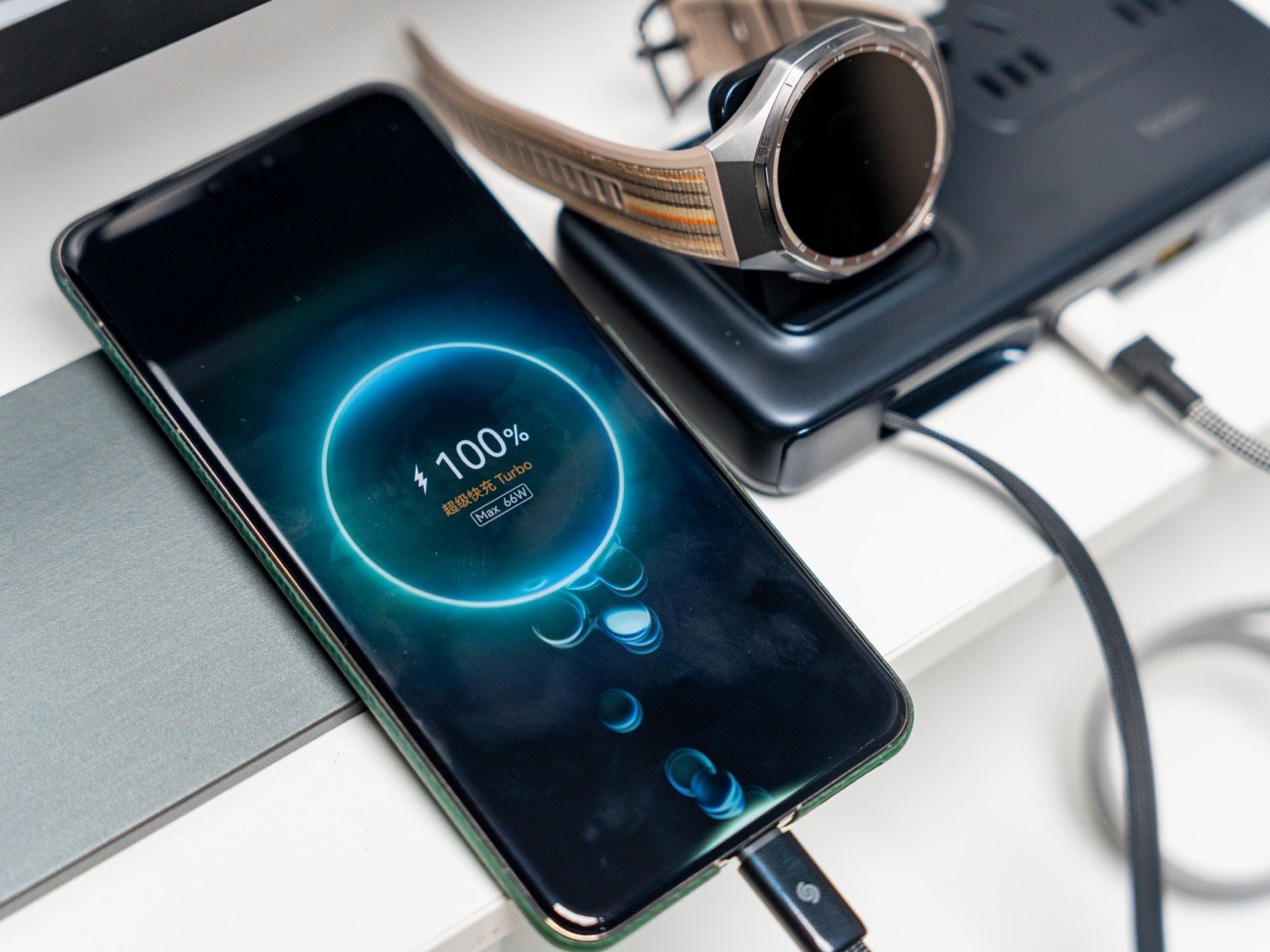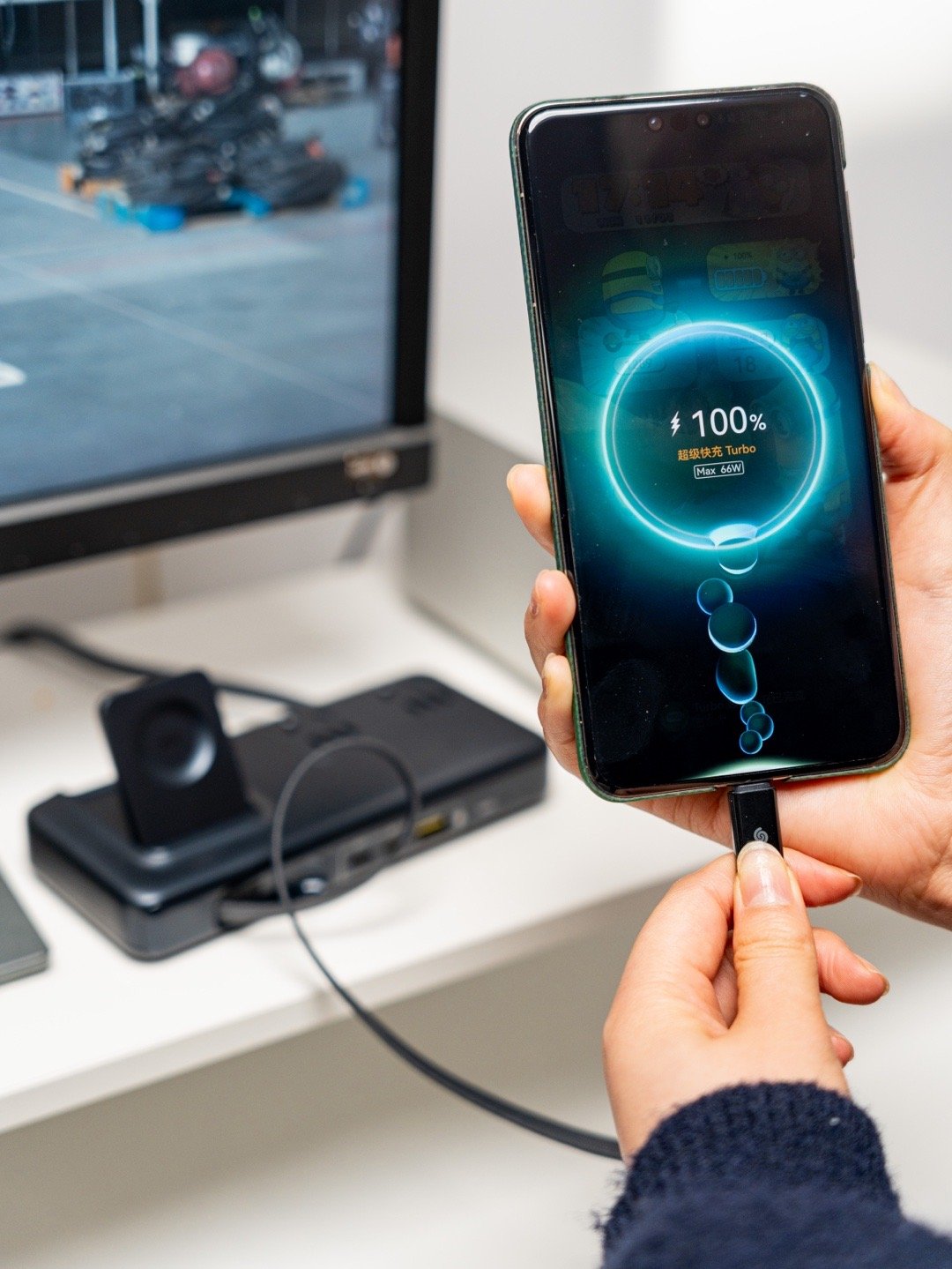 排插、充电器、数据线全整合,华为手机、手表、平板这些设备同时快充都不在话下,66W超级快充快速补能,手表还能无线充,往上面一贴就来电,非常方便。自带的100W伸缩线,拉出来就能用,收起来也不占地方,桌面瞬间清爽好多好多!