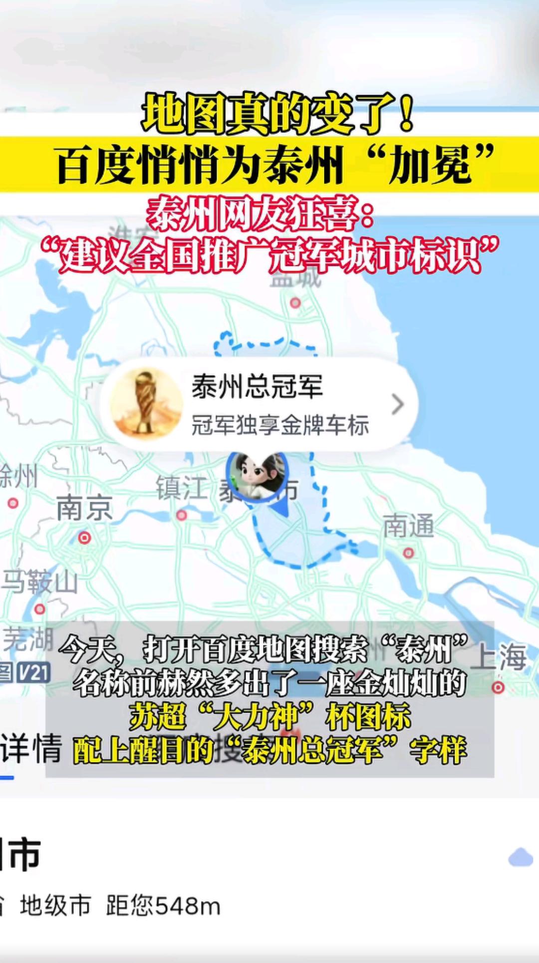 地图真的变了!百度地图悄悄为泰州队加冕,只要搜索泰州,就会出现总冠军的标识! 在不影响用户功能体验的情况下,这一波操作确实给足了泰州的排面! 看来以后相关的赛事也可以安排这种小彩蛋,虽然这种小彩蛋没有什么用,但是对于当地人来说是一个非常惊喜的事情。 各位是怎么看的?欢迎评论区留言。