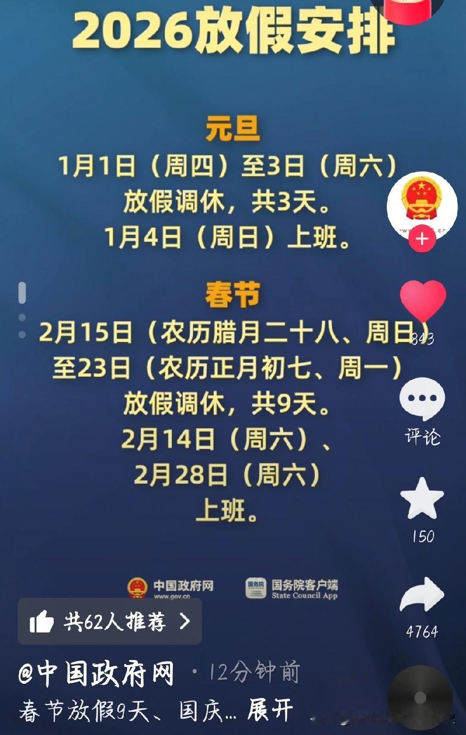 春节连休9天!我先笑后愁,你呢? 刚看到春节能休9天,我差点从椅子上蹦起来!这可是头一回有这么长的年休假,终于能好好陪爸妈待几天。 可定睛一看调休安排,我这笑就僵住了。节前要补班,节后还得补,一开工就得连轴转6天,想想都头大。而且咱打工人心里门儿清,这9天里得刨去路上的时间,要是家远,光来回就得耗两天,真正能跟家人唠嗑吃饭的日子也没剩多少 。 不过吐槽归吐槽,能多几天假总归是好的。已经盘算着提前抢票,哪怕节后累点,能在家多吃几顿老妈做的饭,值了!你们是打算回家还是出门玩? 连休9天!史上最长春节假期来了 节日调休