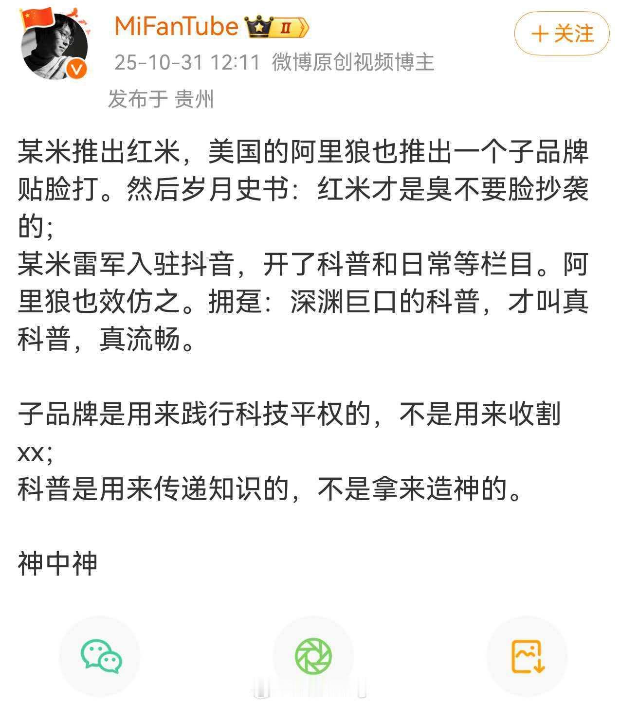 这段话本质是用“造谣式关联”+“双重标准”构建了一套毫无逻辑的批判话术。一边无凭无据将莫须有的“阿里郎”标签扣给某为?一边对科技企业的正常经营行为搞“选择性批判”:小米推红米是“践行科技平权”,“阿里郎”有类似子品牌布局就成了“贴脸打”;雷军做抖音是“科普和日常”,换个对象就成了“造神”?这种只看立场、不问事实的评判,本质是为了制造对立而捏造舆论靶子。