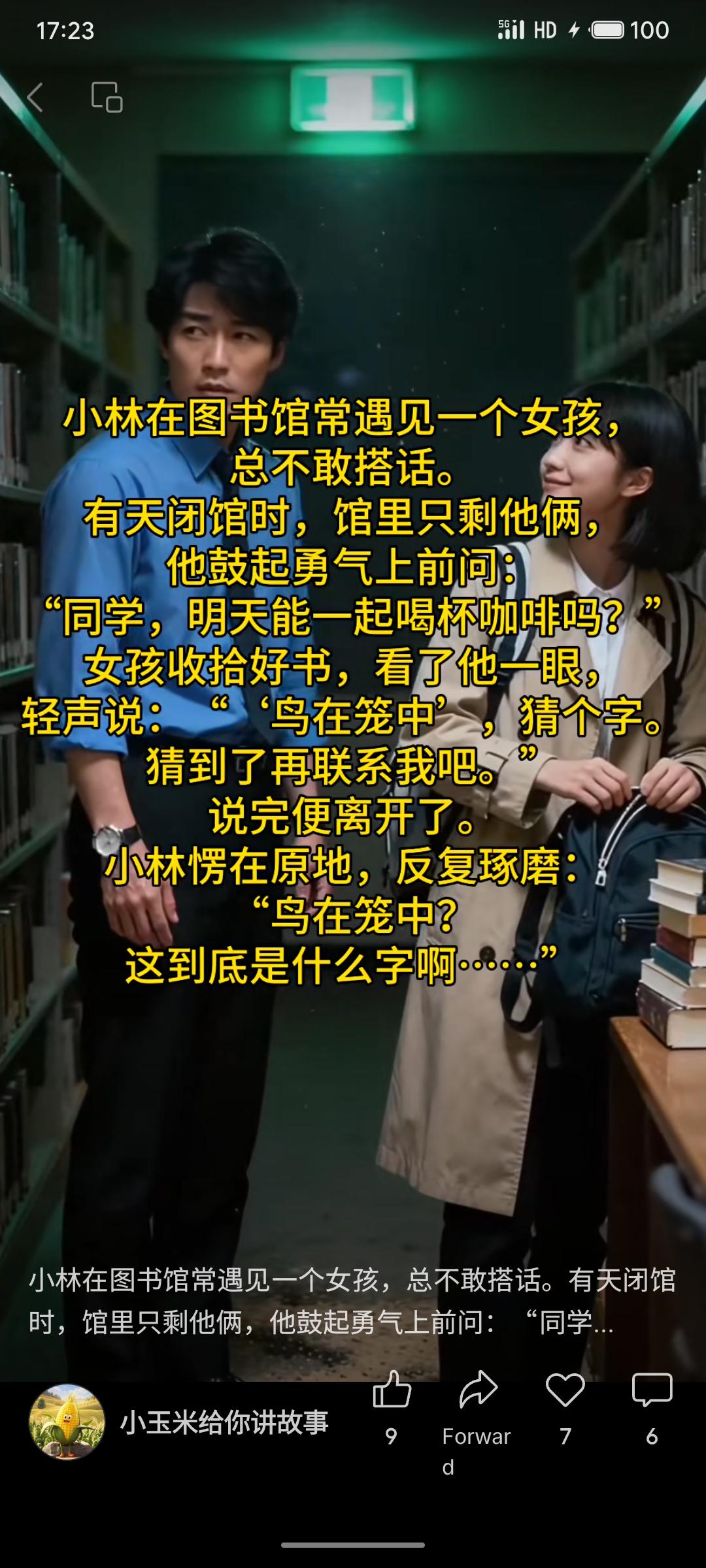 小林在图书馆常遇见一个女孩却不敢搭话。一次闭馆时,他鼓起勇气邀请对方喝咖啡。女孩留下“鸟在笼中”的字谜让他猜,表示猜出后再联系,随后离开。小林独自反复思索这个字谜的含义。