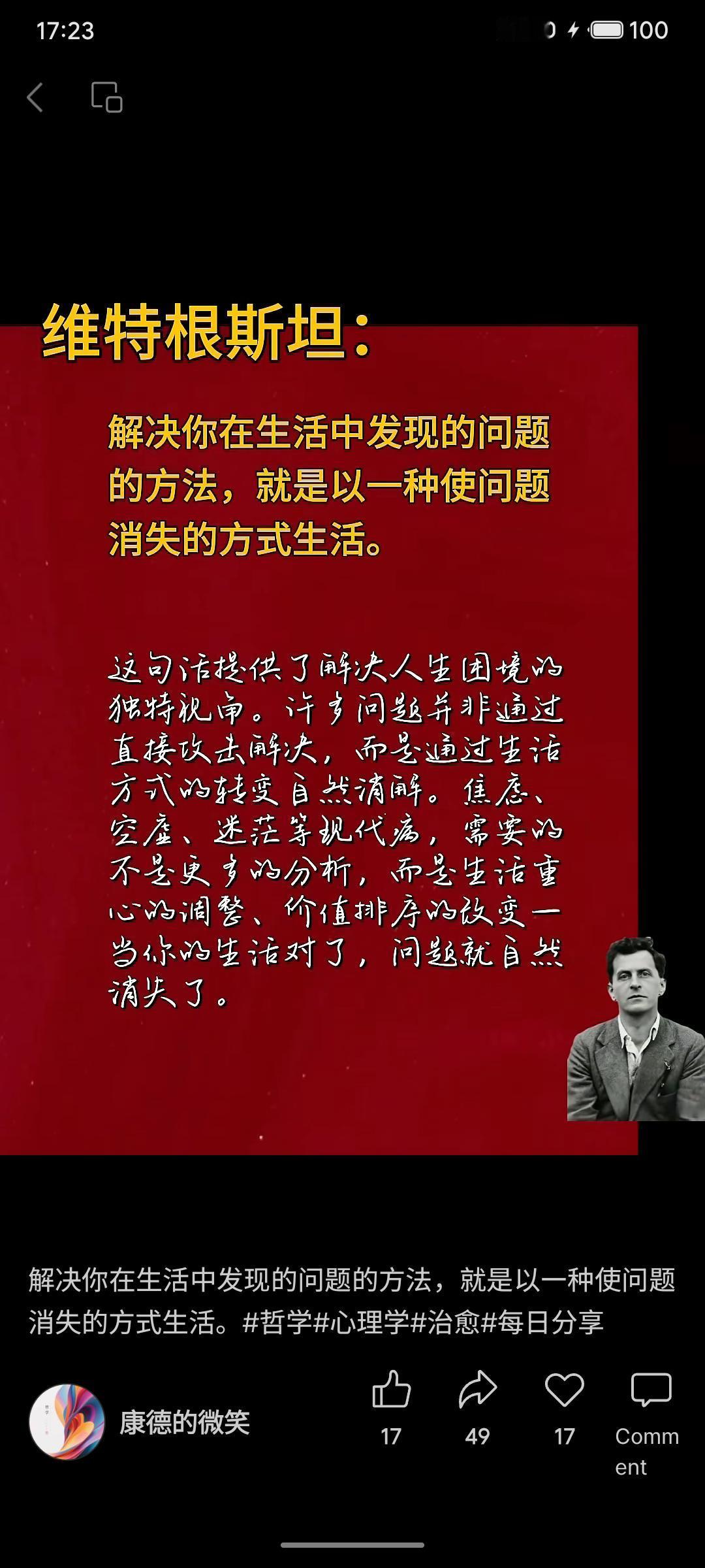 维特根斯坦提出:解决生活问题的方法是以让问题消失的方式生活。许多困境并非靠直接解决,而是通过调整生活方式与价值排序,当生活回归正轨,问题便自然消解。