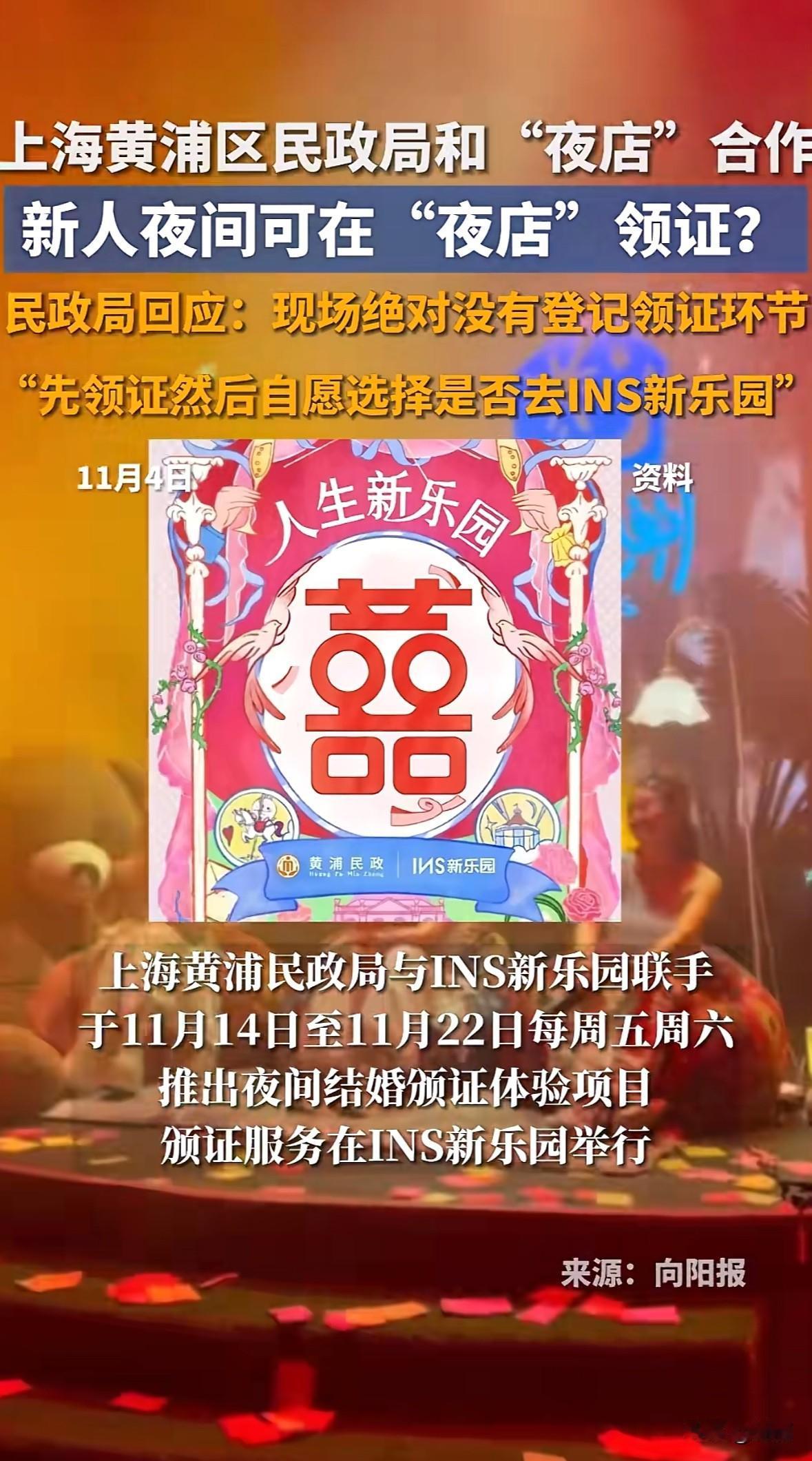 上海黄浦区民政局要和INS新乐园搞夜间结婚颁证活动了,11月14日到22日的每周