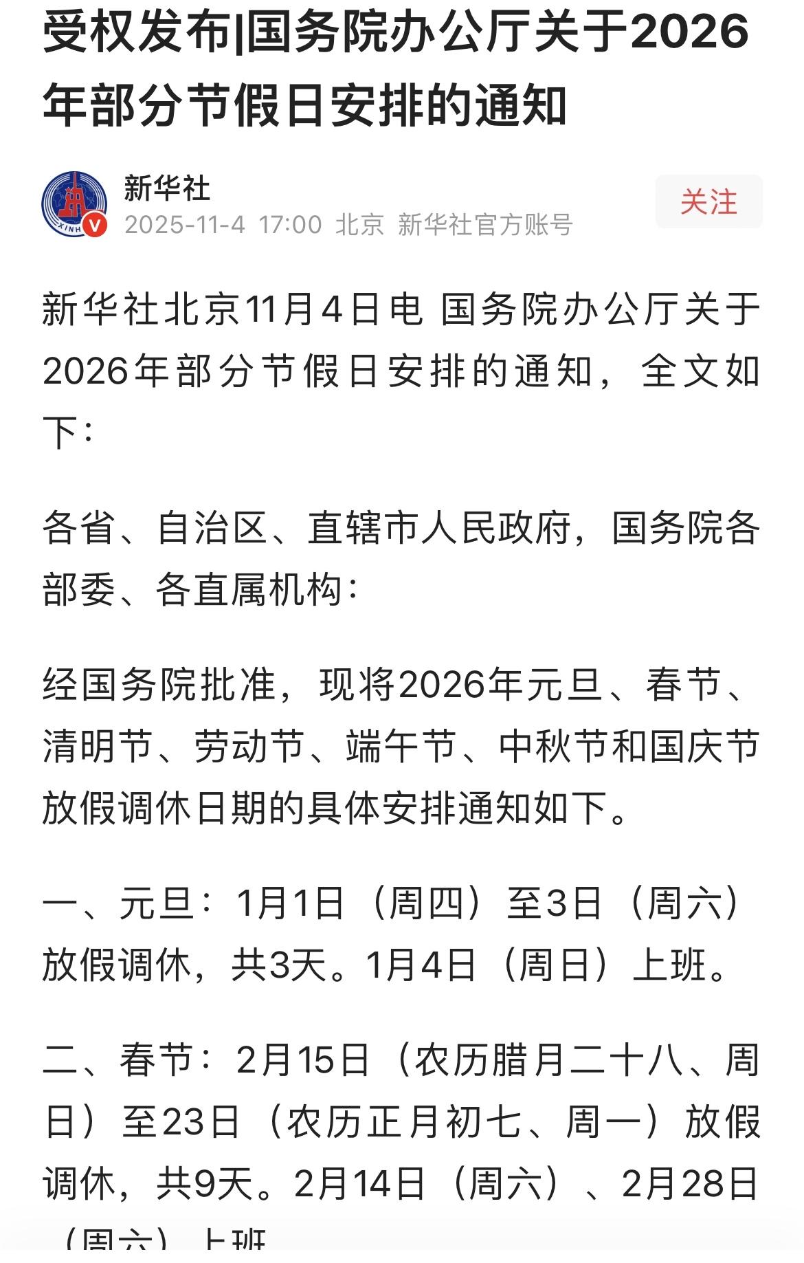 史上最长假期来了! 这可真是个好消息,令全国人民沸腾起来了! 官方已经明确:26年春节假期有九天,太让人期待了!按照这个放假长度,能好好过个年了。 以前春节假期短,走亲访友、放松休息都觉得时间紧巴巴的。要是有九天假期,先留出几天陪家人好好吃团圆饭、唠唠嗑,再去拜访亲戚。剩下的时间还能安排个短途旅行,换个环境放松心情。 不像以前假期一结束就累得要接着上班,这次能更从容地享受节日氛围,把自己从忙碌的生活中抽离出来,好好感受春节的热闹和温馨。 但是依然有人不满足,有网友表示,希望国家把春节假期调到元宵后第一天上班,因为过年对我们中国节日来说是最团圆最隆重的节日。 还有网友说,建议春节放放假15天,正月十六开始上班。 大家怎么看呢?