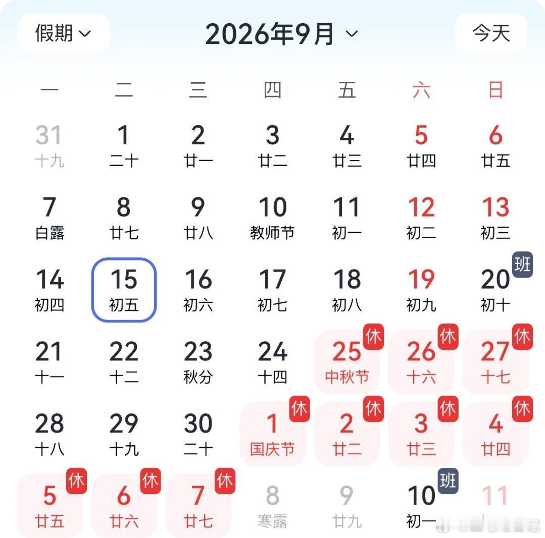 2026年的节假日安排出来了,中秋国庆终于解绑了!休完中秋休国庆,甚至中间请假3天可以休13天,但是还是要调休中秋国庆终于解绑了