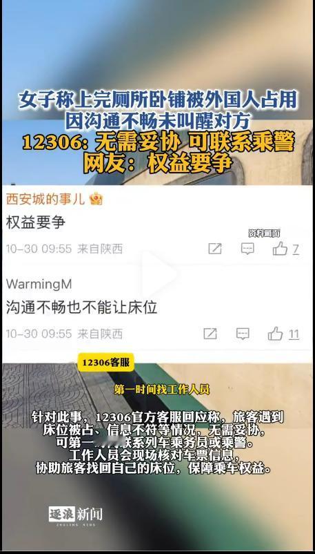 自己花钱买的卧铺转头居然被外国人占了?官方回复很霸气! 事情起因是,一位姑娘自