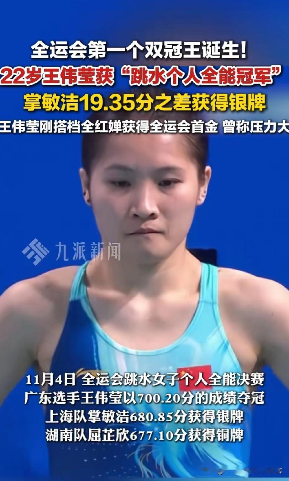 全红婵不参加10米单人赛,广东跳水又出王牌!王伟莹夺单人冠军 全运会跳水赛场杀出来匹黑马!广东选手王伟莹在女子个人全能决赛中,把10米跳台和3米跳板都玩明白了,直接夺冠封神! 咱之前还好奇全红婵咋不参加单人赛,现在懂了——广东跳水这是藏着王牌呢!王伟莹这水花控制绝了,跳台跳板双项全能,把“水花消失术”玩出花来。有人说她是广东跳水新门面,也有人觉得全红婵不参赛少了看点。 话说回来,咱们跳水队真是卧虎藏龙,你觉得王伟莹这波夺冠,能接棒全红婵成为新顶流吗?