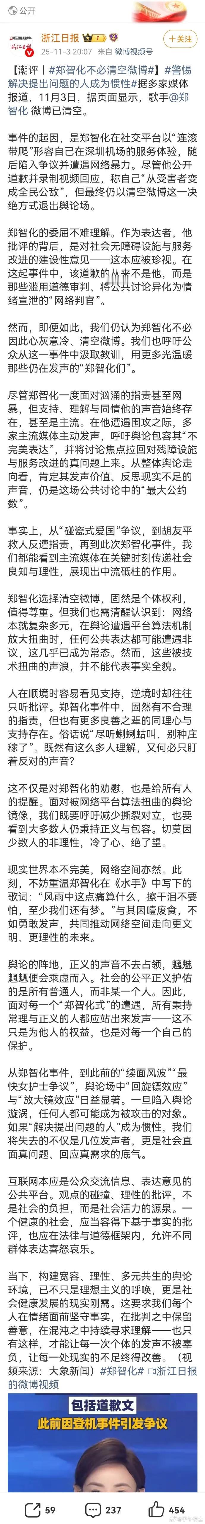 被浙江日报的发文气笑了 如果这事情发生在杭州萧山机场,他们怎么说? 如果没有监控,那机场,升降机司机不知道会被网暴成什么样?他们冤不冤! 有句古话,已所不欲,勿施于人,不要站在假道德高地上指责别人!