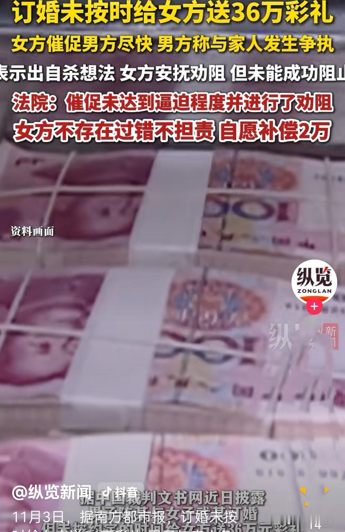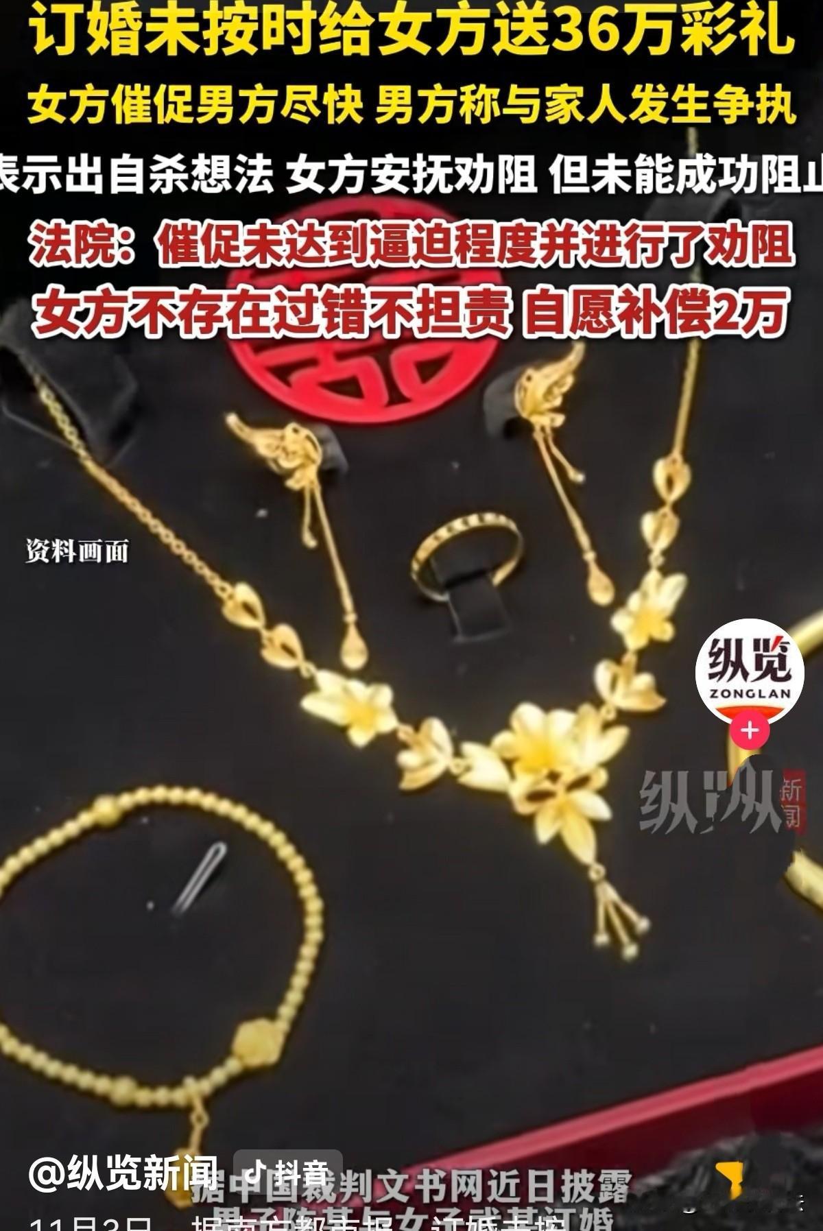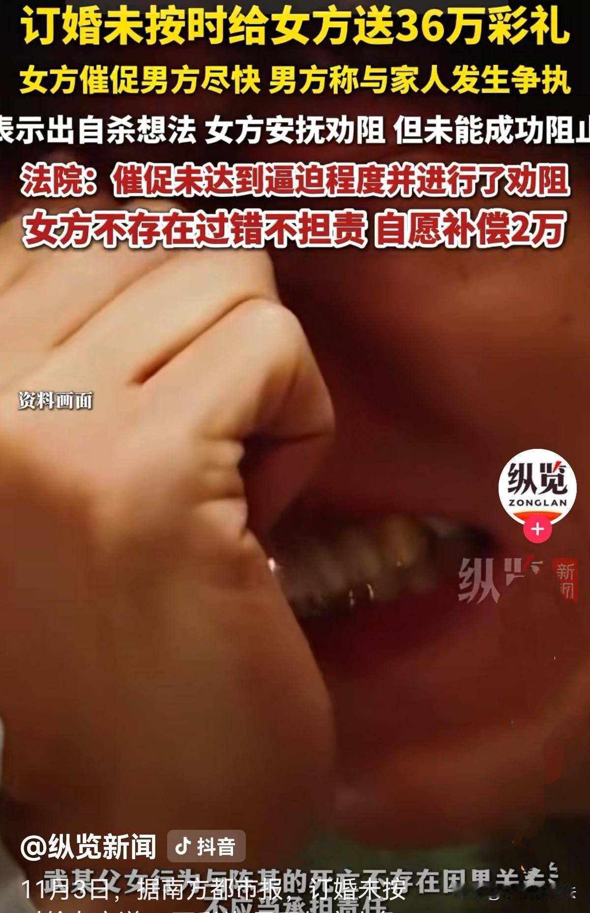 河南商丘,男子订婚,答应支付女方36万彩礼,但快到约定的时间,却未把彩礼全部送到,女方催促,男子回家与父母就此事争执后,赌气跑出家门,而后给女友发信息说不想活了。女友劝他冷静,不要做傻事,可男子还是轻生溺水而亡。男子父母认为是女方及其父母逼的太紧,儿子承受不住,走了绝路,存在过错,将他们告上法庭,索赔20万,法院这样判的! 陈某家境普通,父母是老实本分种地人,自己也是平凡无奇的青年,所以婚姻大事一直没着落。 看着同龄的伙伴都成婚生子,有的孩子都打酱油了,自己还光杆司令一人,他心里着急,父母更着急! 3个月前,媒人上门提亲,全家人都乐坏了。 女方是邻村的武某,两人见面后,彼此印象不错,聊了一段时间后,倒也情投意合,双方家长一拍即合,很快敲定了婚事。 女方提出36万彩礼,对于陈某的家庭,肯定是个天文数字,可对这门难得的婚事,他们又不想错过,陈家还是咬着牙答应下来。 陈某父母靠着几亩田地和打零工攒下的积蓄,再加上向亲戚朋友借来的钱,才勉强凑够了大部分彩礼。 可临近约定日期,陈家人该借的都借了一个遍,最后36万彩礼钱还是差一点凑不够。 陈某急得满嘴起泡,看着愁白了头的父母,再想想即将到手的婚事,他夹在中间左右为难。 武某那边也开始着急了,眼看着约定的日子越来越近,彩礼却迟迟没有动静,身边的亲戚朋友时不时问起,让她心里很不是滋味。 但订婚时说好了的,给陈家筹钱的时间,总不能半路变卦。 于是,武某打电话催促陈某,让他说话算数,到约定送彩礼的日子要送钱来,失约就不好看了! 陈某对武某说会想办法,不会失约,便默默挂断电话。 陈某回到家后,又和父母就彩礼的事讨论起来,父母说在想办法。 想办法想办法,都快到约定日期了,再没办法,这桩婚事就保不住了,陈某很激动,情绪有些失控。 陈父知道儿子着急,可看他这态度也很伤心:你这是逼父母、埋怨父母吗?我们全部家当都拿出来了,难不成让我们砸锅卖铁?老两口老泪纵横! 我、我不是那个意思!你们不理解我!陈某说着摔门而出。 他情绪低落,在冷飕飕的河边游荡,他思绪万千,越发觉得自己无能,对不起年迈父母,让他们为自己操心,也对不起女友,对自己钟情却拿不出彩礼! 陈某越想越消沉,于是给武某发了一条信息,说自己跟家里彻底闹翻了,现在一个人在外面,活着真没意思,或许死了就解脱了。 武某看到消息后吓得心都揪了起来,赶紧拨通陈某的电话。电话接通后,传来的是陈某压抑的哭声:对不起,彩礼凑不齐,婚也结不成了,父母也不理解,我活着还有什么用? 武某吓出一身冷汗,耐心地劝说他,钱的事可以再商量,千万别胡思乱想,做傻事!所有的困难都能解决的! 武某劝了好久,陈某情绪似乎稍微平复了一些,说自己会再想想,然后就挂了电话。 武某还是不放心,又给陈某发了好几条微信,让他有什么事随时联系自己,还表示会跟父亲商量彩礼的事,让他别担心。 可她万万没想到,这竟是她和陈某最后的沟通。 第二天一早,武某就接到了警方的电话,告知她陈某在附近的河边溺水身亡,遗体已经找到。 这个消息像晴天霹雳,让武某瞬间瘫坐在地上,眼泪止不住地往下流。她怎么也不敢相信,那个前一天还在电话里跟自己哭诉的人,就这样永远地离开了。 而陈某的父母,在经历了丧子之痛后,将所有的怨恨都指向了武家。他们认为,若不是武某一次次催促彩礼,儿子也不会压力过大,更不会走上绝路。 悲痛之下,陈某父母将武某及其父亲告上了法庭,要求赔偿20万元。 武某和父亲更是觉得委屈,武某说当时只是想问问彩礼的事,没想到会发生这样的事,我也尽力劝阻他了,可结果还是这样。 《民法典》第1165条第1款:行为人因过错侵害他人民事权益造成损害的,应当承担侵权责任。 《民法典》第1173条:被侵权人对同一损害的发生或者扩大有过错的,可以减轻侵权人的责任。 36万元彩礼是双方协商一致的结果,武某在约定时间后催促给付,属于对自身合法期待利益的合理主张,未采取暴力、威胁等违法手段,行为本身不具有违法性。 武某在得知陈某与家人争执并流露自杀想法后,已及时进行安抚劝阻,并联系陈某亲友,尽到了合理的注意与救助义务,不存在故意刺激或放任危险发生的过错。 陈某作为完全民事行为能力人,对自身生命安全负有最高注意义务,其行为是自主意志选择的结果,属于直接原因。 法院审理认为,武某及其父母的催促行为未达到足以逼迫他人轻生的程度,与死亡结果之间不存在法律上的因果关系。不承担侵权责任。 《民法典》第6条:民事主体从事民事活动,应当遵循公平原则,合理确定各方的权利和义务。 武某虽无责任,但她自愿补偿2万元,为安慰陈某父母,也表示人道主义关怀和自身心灵慰籍! 10月15日,法院判决:武某补偿陈某父母2万元。 您觉得陈某的死,女方有责任吗?