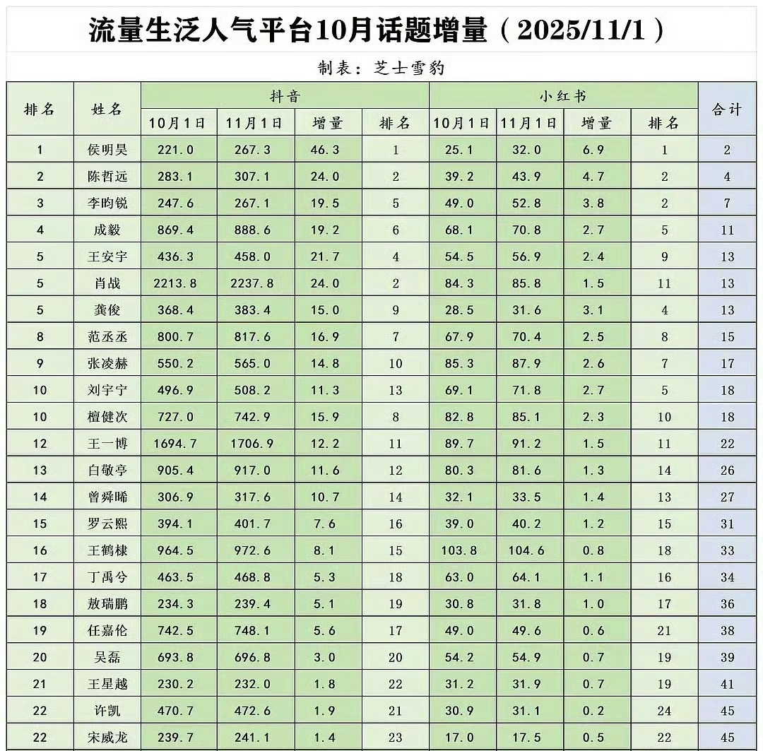 在这个扑剧和翻车是常态的内娱,现在艺人最难得的就是保持稳定且持续的有效曝光,侯明昊近一年闷头扎剧组的同时还做到了戏里戏外全开花。从大梦归离到入青云,从春晚到生日会再到音乐节,出圈了一次又一次,虽然本人很低调很沉稳,但务实派的声量也有实打实地反馈在客观数据上,十月泛人气平台话题增量第一、新剧超点小十天了主页浏览量还能稳定在280w+,待播角色期待值前三全包圆……
