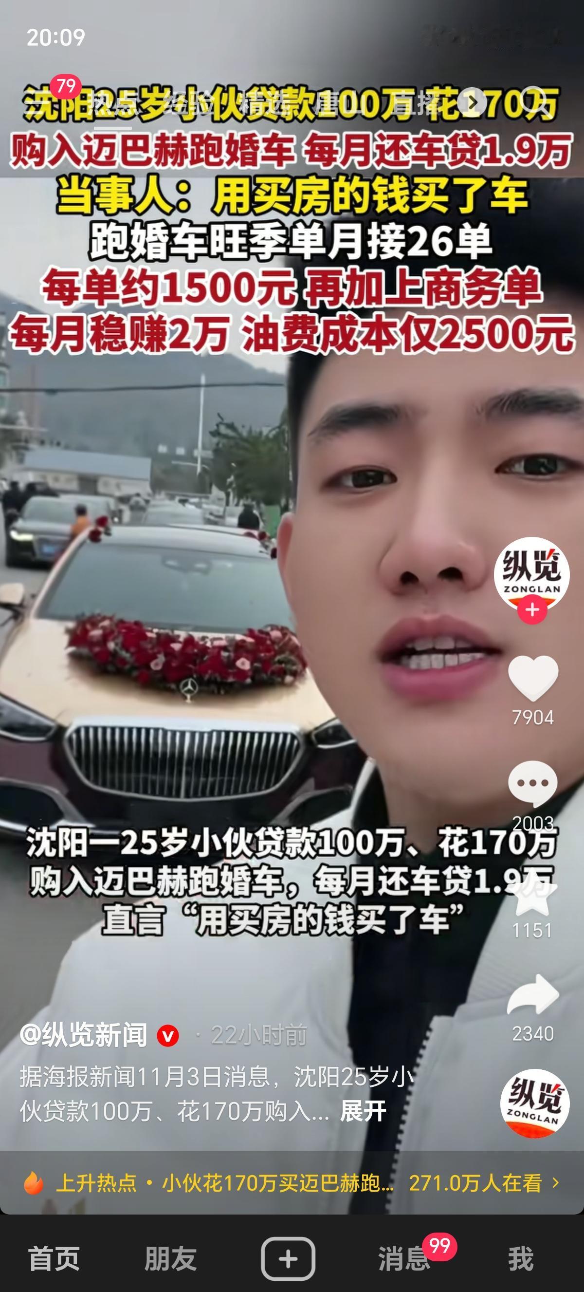 沈阳小伙神操作!砸170万买迈巴赫跑婚车,放弃买房每月稳赚2万? 最近沈阳一位25岁小伙的操作火了!放着刚需房不买,硬是凑了70万首付,再贷款100万,花170万拿下一辆迈巴赫跑车,每月要还1.9万房贷...哦不,是车贷!这波操作让不少人直呼“看不懂”,但小伙却把日子过得风生水起。 小伙说,当初决定买车时,家里人都反对,觉得不如买套房踏实。但他算了笔账:沈阳现在一套刚需房首付也得几十万,月供几千块,只能当“房奴”;但买辆迈巴赫跑婚车和商务单,反而能当“车老板”。事实证明他没赌错,婚车旺季的时候,他一个月能接26单,每单大概1500元,光婚车收入就有3.9万。再加上平时的商务接待单,一个月收入稳稳超过4万。 当然赚钱也不是没成本,迈巴赫的油费可不是小数目,每月油费大概2500元。扣除1.9万的月供和油费成本,小伙每月纯利润能有2万左右。对于25岁的年轻人来说,这样的收入已经相当可观了。他笑着说:“现在房子总价高,首付压力大,不如先买辆车赚钱,等攒够了钱,再考虑买房也不迟。” 不过也有人觉得小伙的选择风险不小,车贷压力大,而且婚车市场受季节影响明显,淡季收入可能会下滑。但小伙心态很好,他说自己已经做好了规划,淡季会多拓展商务单,同时也在琢磨和婚庆公司长期合作。 到底是先买房安稳度日,还是先买车创业赚钱?每个人的选择都不一样。沈阳这位小伙的操作虽然大胆,但确实靠自己的努力实现了月入2万的目标。你觉得他的选择明智吗?